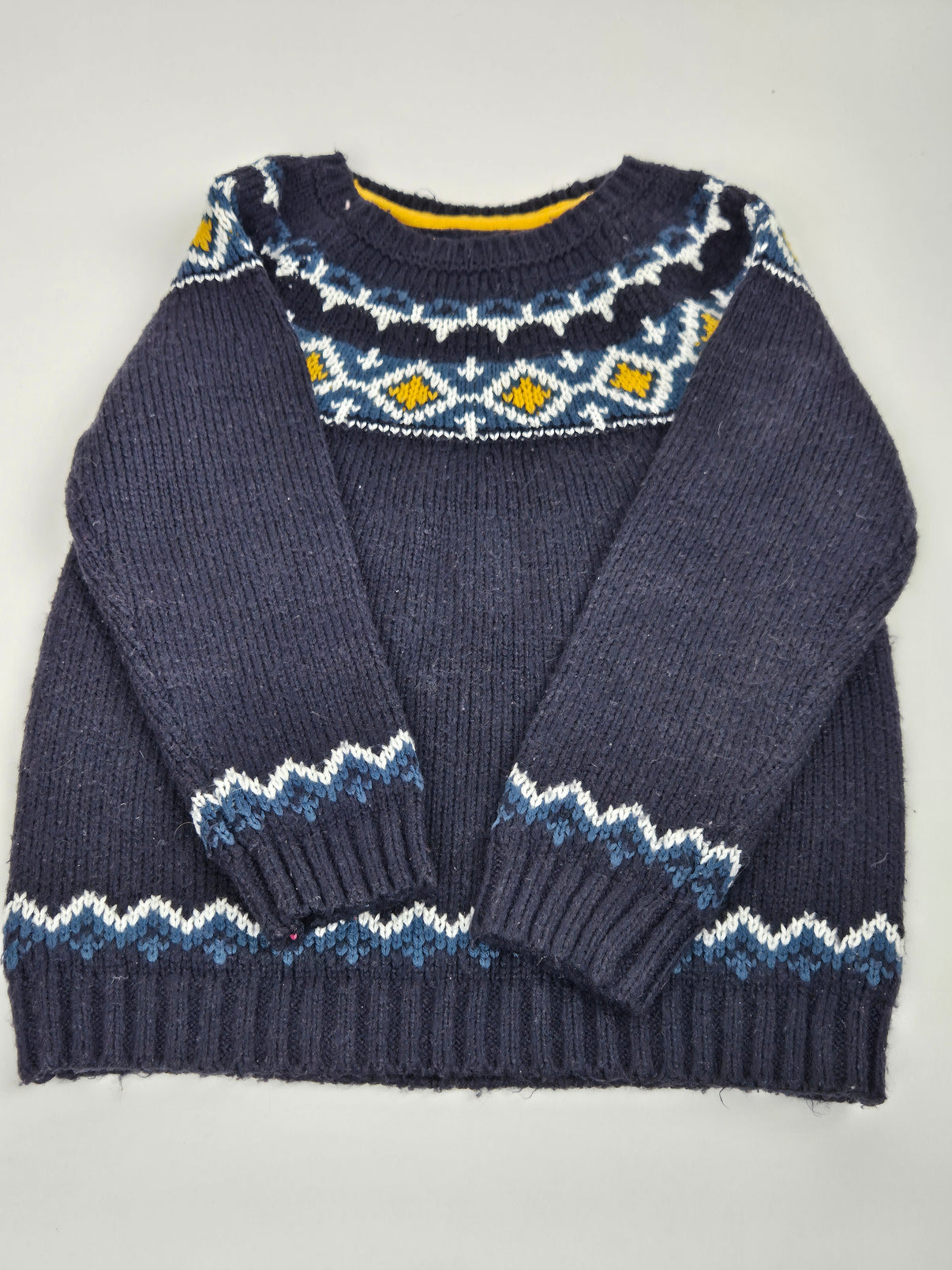 Hřejivý zimní svetr z Primarku pro kluky, velikost 128. Tmavě modrý základ doplňuje tradiční norský vzor v bílé, modré a hořčicově žluté, který krásně vyniká na ramenou, manžetách i spodním lemu. Silnější úplet a měkký vnitřek zajišťují pohodlí a teplo během zimních dní. Skvělý kousek do školy, na zimní procházky nebo rodinné oslavy. Nadčasový a stylový svetr, který zahřeje i potěší.