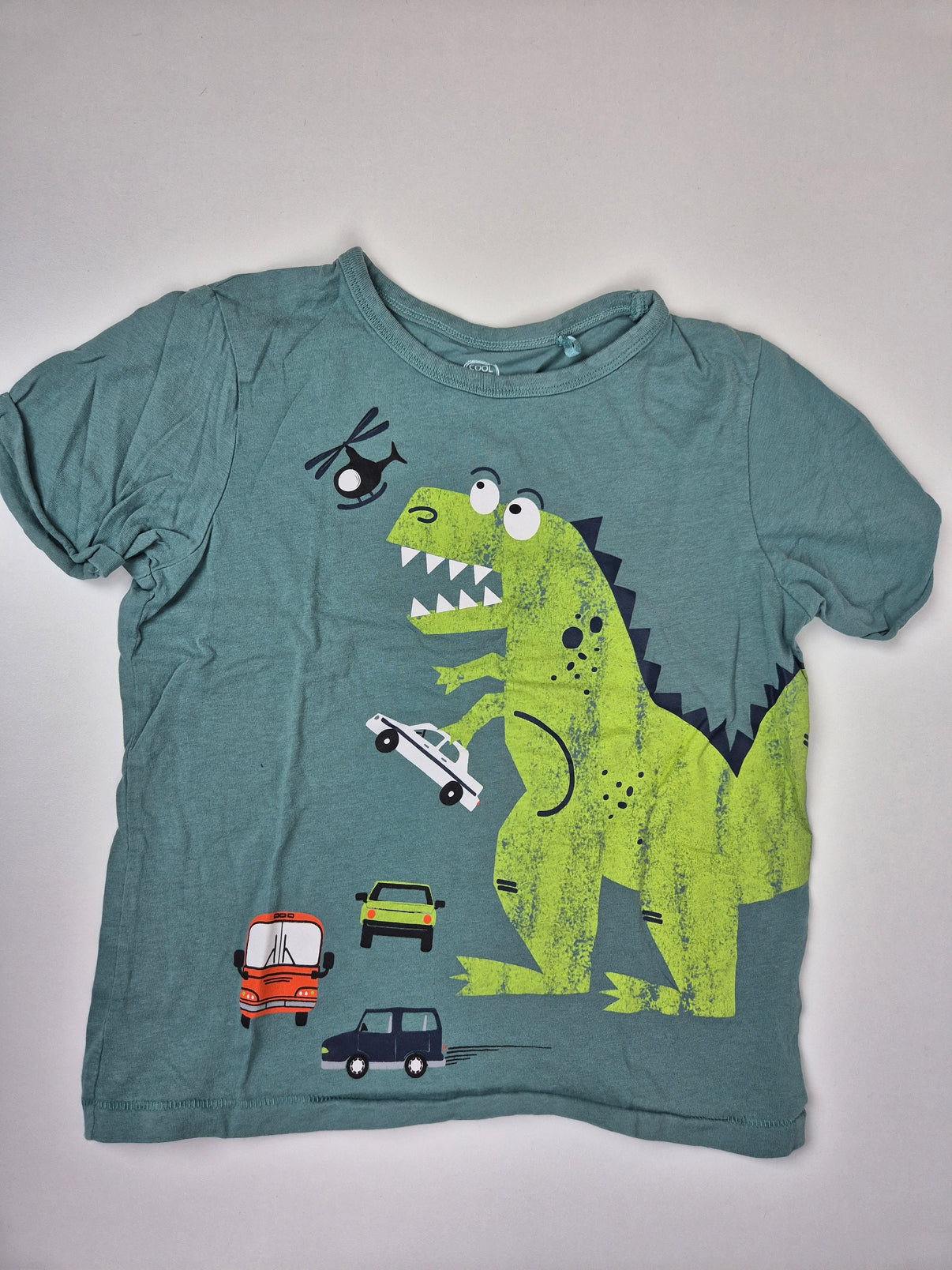 Petrolejově zelené tričko značky Cool Club s velkým hravým potiskem dinosaura a autíček. Tlumený zelenomodrý odstín působí klidně a moderně, výrazný dinosaurus v jasně zelené barvě spolu s motivy dopravních prostředků dodává tričku veselý a dobrodružný charakter.