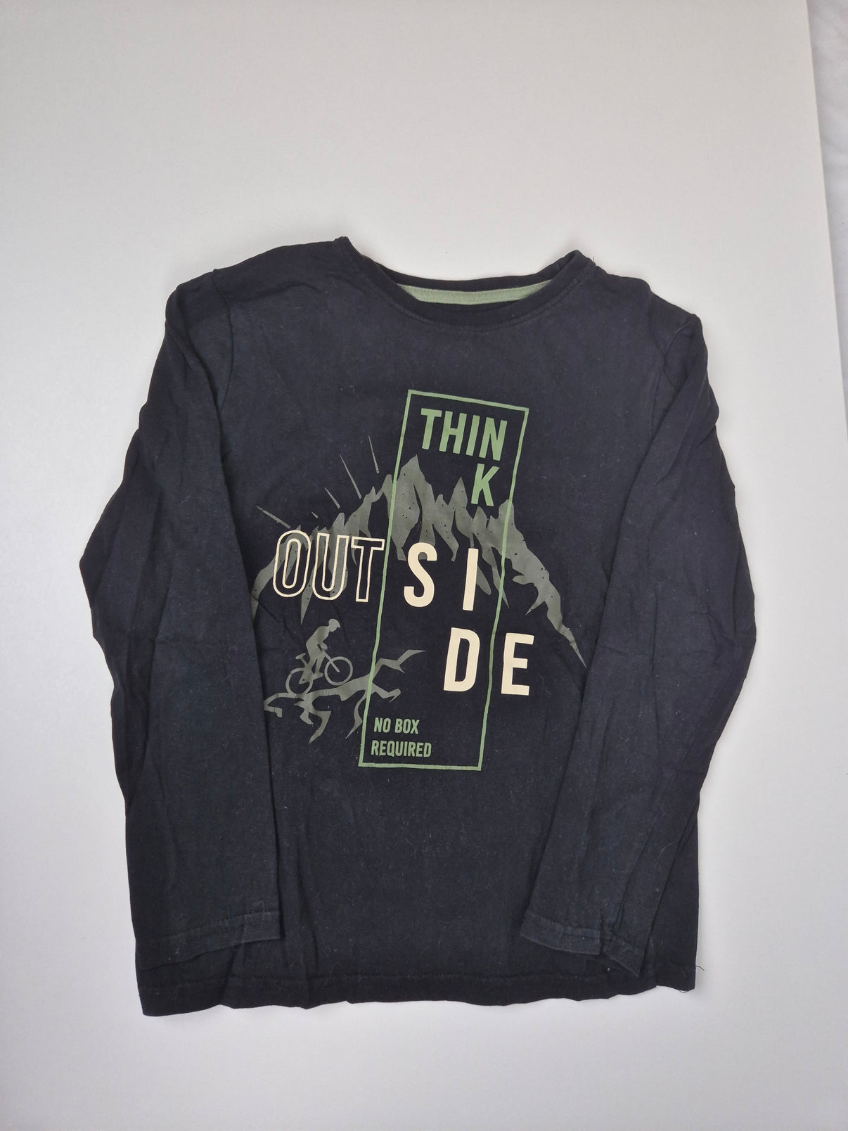 Černé tričko s dlouhým rukávem značky Destination s outdoorovým potiskem a nápisem Think Outside. Tmavý základ doplňuje zeleno-béžová grafika hor, cyklisty a ptáků, která působí dobrodružně a inspirovaně přírodou.
