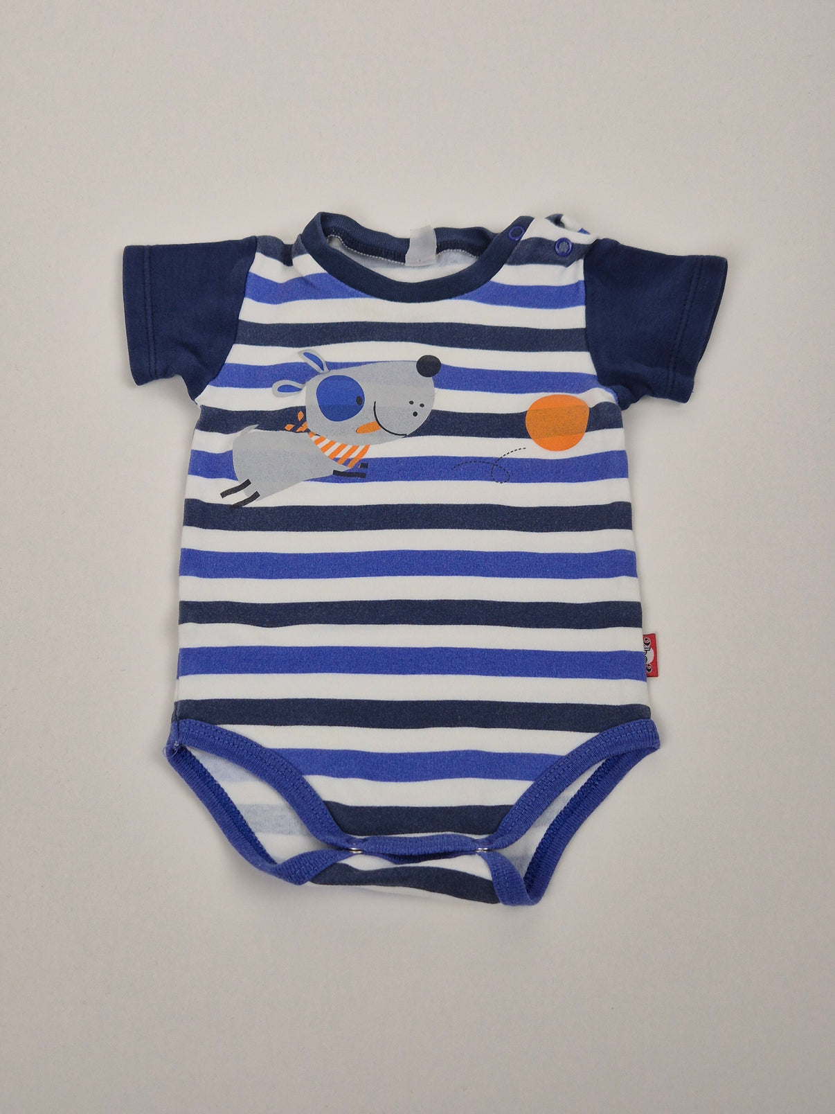 Roztomilé pruhované body v modro-bílé kombinaci s veselým potiskem pejska a míčku je ideální pro malé milovníky zvířátek. Kontrastní tmavě modré rukávy a lemy dodávají outfitu moderní vzhled, zatímco praktické zapínání na rameni a mezi nožičkami usnadní oblékání i přebalování. Měkký a prodyšný bavlněný materiál zajistí pohodlí po celý den.