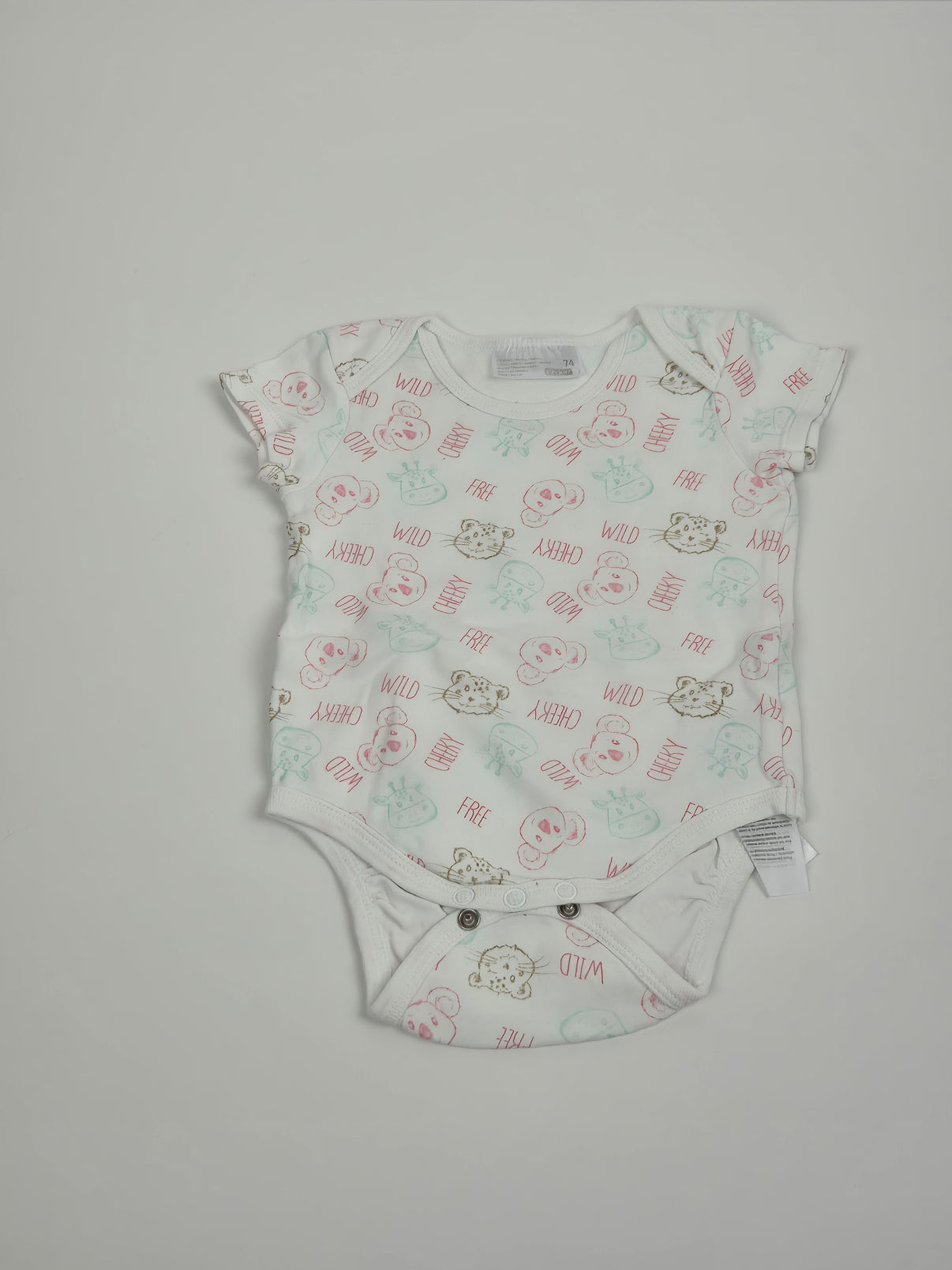 Veselé body značky Ergee ve velikosti 74 potěší všechny malé divošky i divochy. Bílý základ zdobí roztomilý potisk zvířecích hlaviček v jemných odstínech růžové, mintové a hnědé, doplněný slovy jako „WILD“, „FREE“ nebo „CHEEKY“. Krátké rukávy a praktické zapínání mezi nožičkami zajišťují pohodlí i snadné přebalování. Měkoučký bavlněný materiál je ideální na běžné denní nošení – do školky, na doma i na ven. Unisex kousek pro holčičky i kluky.