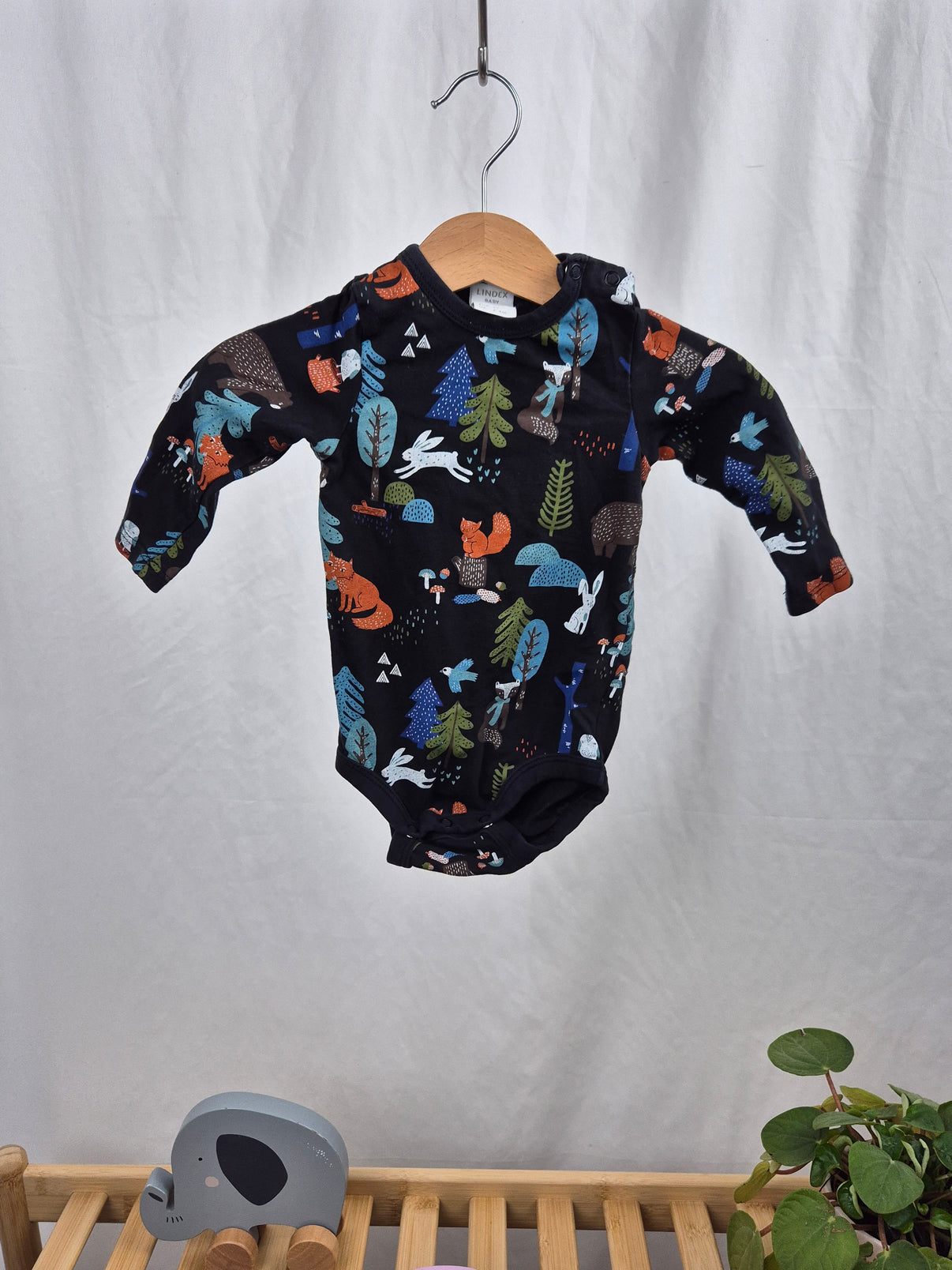Pohodlné kojenecké body s dlouhým rukávem od značky Lindex v hravém přírodním designu. Tmavě modrý podklad zdobí roztomilý lesní motiv s liškami, zajíčky, stromy a dalšími zvířátky v tlumených tónech...