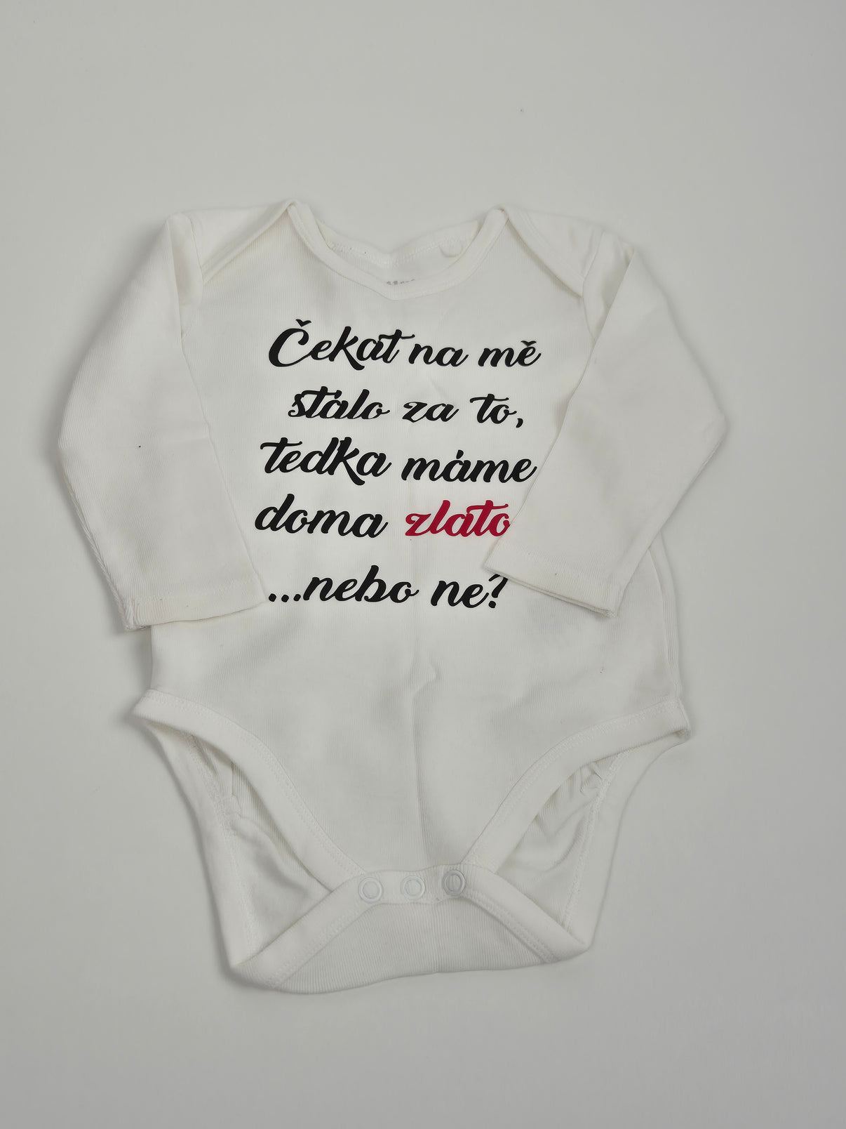 Vtipné bílé body s dlouhým rukávem od značky Lupilu ve velikosti 74/80 rozzáří každý den svým originálním potiskem: „Čekat na mě stálo za to, teďka máme doma zlato... nebo ne?“ Text je vyveden v kombinaci černé a červené, což mu dodává šmrnc a hravost. Praktický zavinovací výstřih a zapínání mezi nožičkami zajišťují snadné oblékání i přebalování. Měkký bavlněný materiál je příjemný na nošení a šetrný k dětské pokožce. Skvělý dárek i každodenní kousek pro malé rošťáky i princezny.