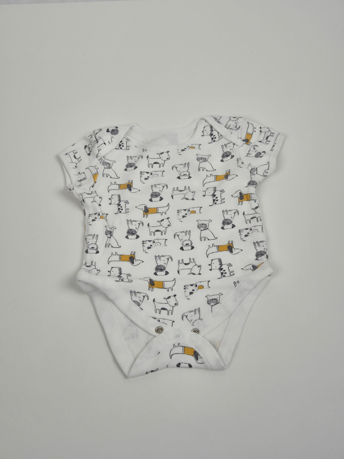 Roztomilé body s krátkým rukávem od značky Primark ve velikosti 74 je ideální volbou pro každodenní nošení. Bílý podklad zdobí hravý potisk různých psíků v černobílém provedení s veselými hořčicově žlutými detaily, které celému kousku dodávají šmrnc. Praktické zapínání mezi nožkami usnadní přebalování, zatímco jemný materiál zajistí pohodlí po celý den. Unisex kousek pro kluky i holčičky – perfektní na doma, do školky i na letní výlety.