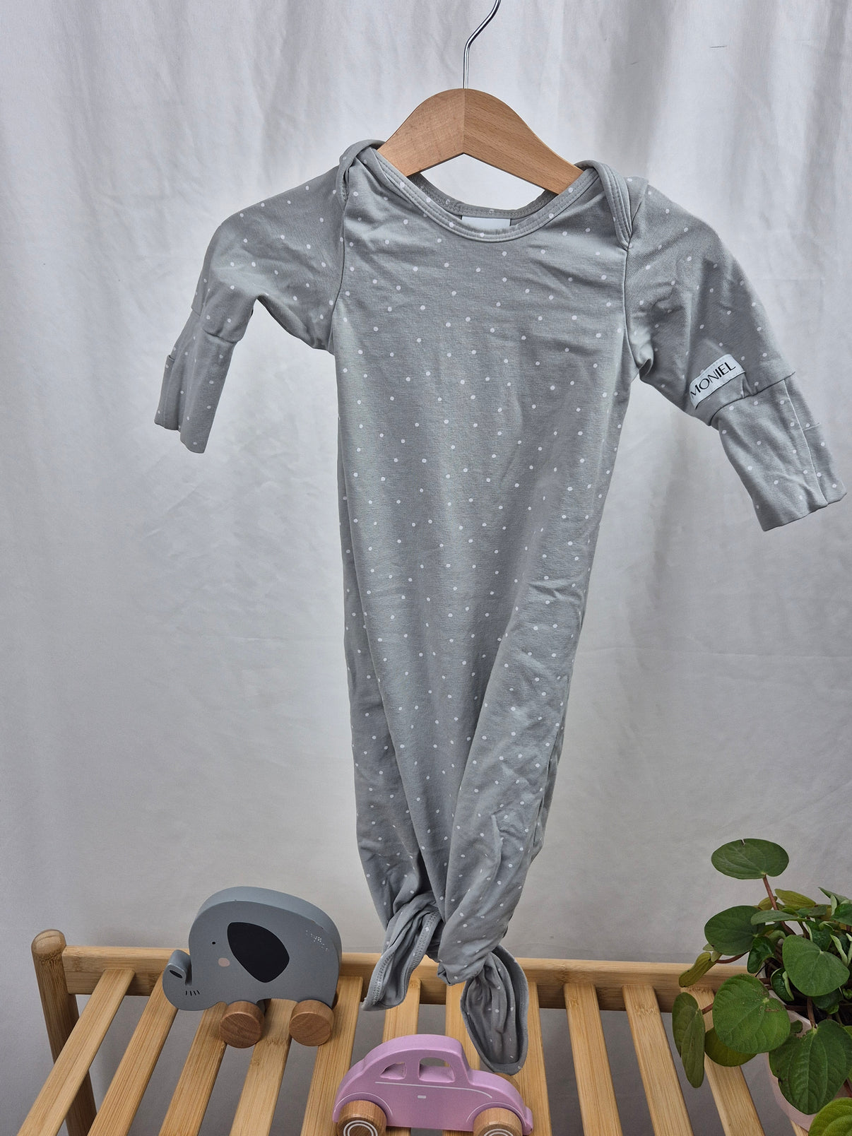 Praktické a stylové body s uzlem od značky Moniel ve velikosti 50/56 je ideální volbou pro úplně nejmenší miminka. Jemný šedý základ s drobným bílým puntíkem působí klidně a elegantně, zatímco uzlovací zakončení umožňuje rychlé přebalování a přizpůsobení délky podle potřeby. Dlouhé rukávy se skládacími rukavičkami chrání před chladem i poškrábáním. Unisex kousek vhodný pro holčičky i kluky – ideální na spaní i jako měkoučký outfit pro první dny doma.