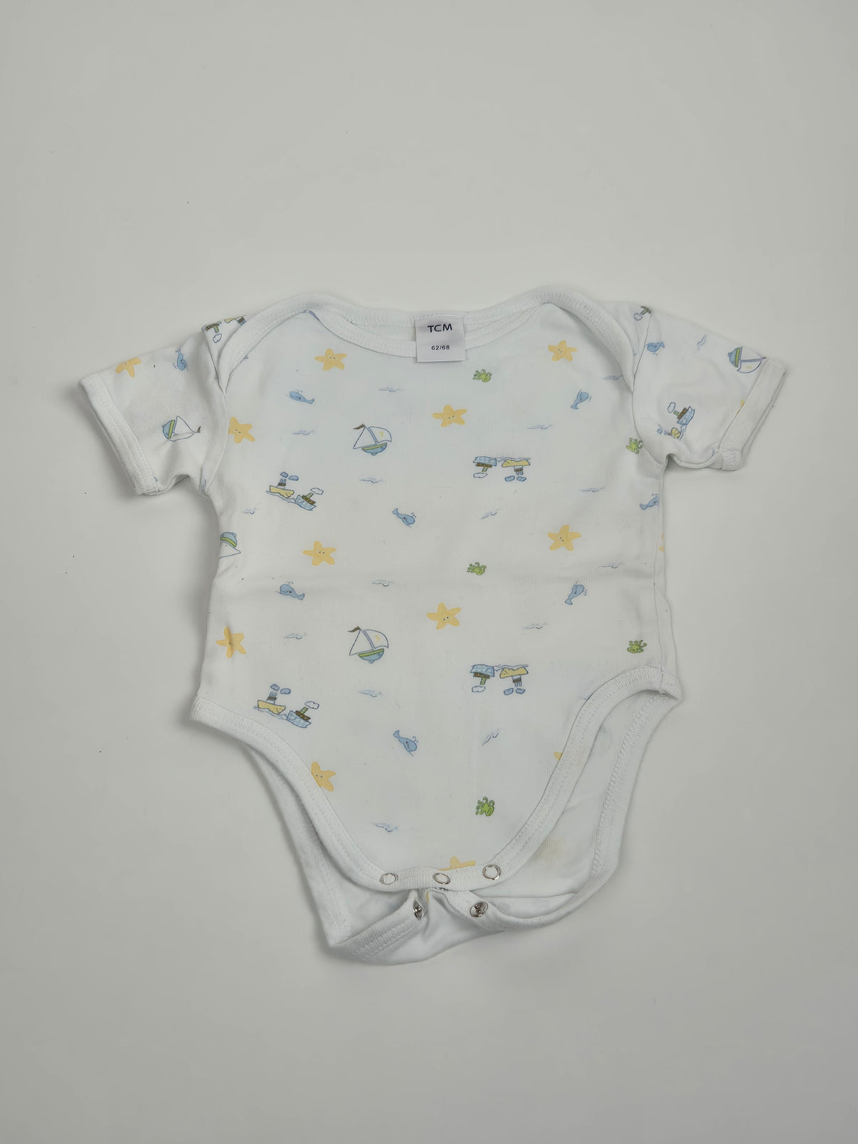 Letní body s krátkým rukávem od značky Tchibo (TCM) v bílé barvě s jemným potiskem námořních motivů jako jsou loďky, hvězdice a rybičky. Praktické zapínání mezi nožičkami a měkký bavlněný materiál zaručí pohodlí po celý den. Ideální volba pro chlapečka na horké letní dny doma i venku.