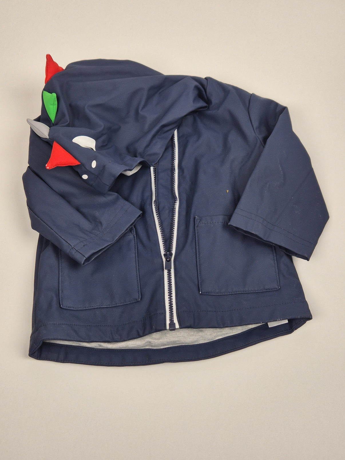 Tmavě modrá bunda do deště s podšívkou značky F&F, která zaujme veselou kapucí s barevnými dinosaurími hroty. Praktické zapínání na zip, dvě přední kapsy a voděodolný materiál dělají z tohoto kousku ideální volbu pro dobrodružství v sychravém počasí.