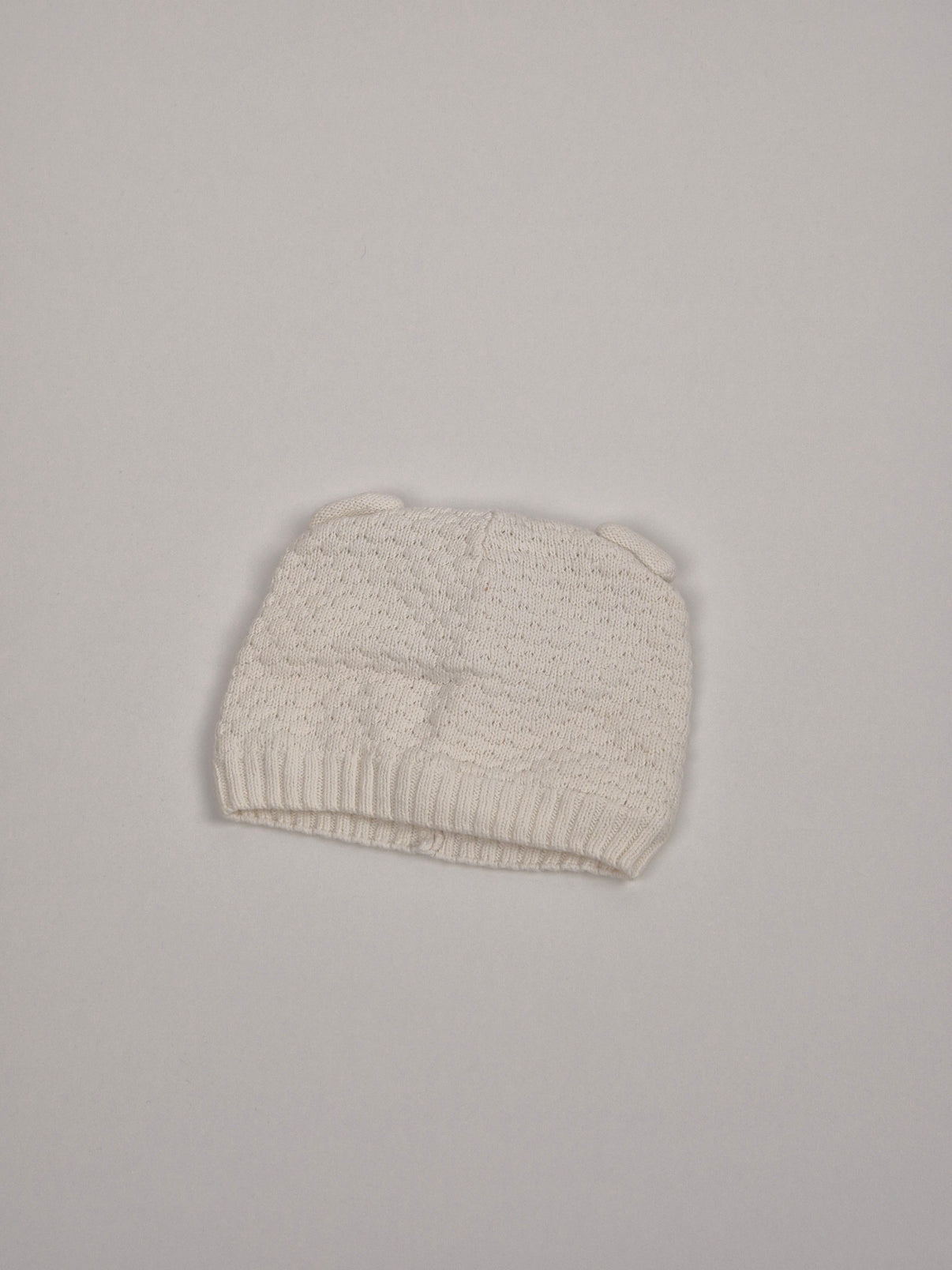 Pletená dětská čepice ve velikosti 74/80 v jemné smetanové barvě s roztomilými oušky. Hebký materiál a pružný lem zajistí pohodlí i hřejivost během chladnějších dnů. Díky neutrálnímu provedení se hodí pro holčičky i chlapečky. Stylový a praktický kousek na podzimní i zimní procházky.