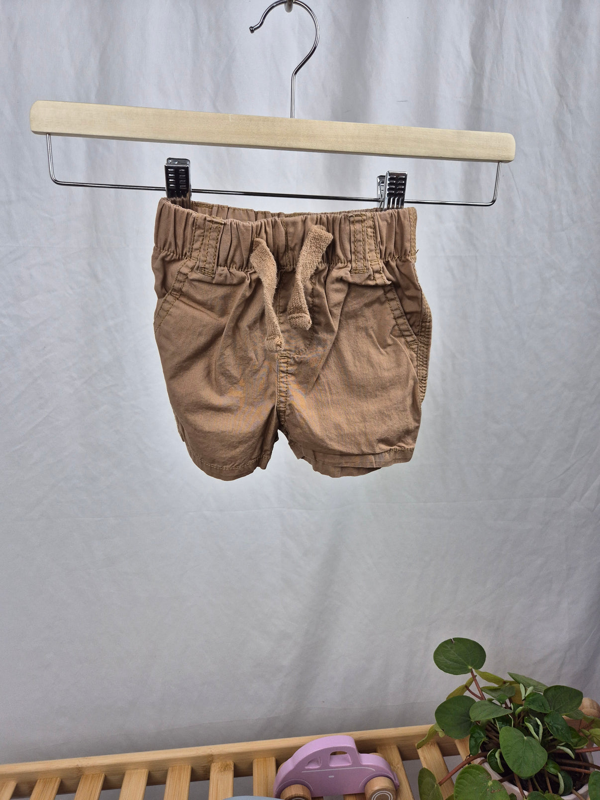 Lehké plátěné kraťasy v hnědém odstínu od značky Primark jsou ideálním kouskem pro teplejší dny. Díky pružnému pasu se šňůrkou se pohodlně oblékají a přizpůsobí se dětskému bříšku. Neutrální barva se skvěle kombinuje s barevnými tričky i košilemi.