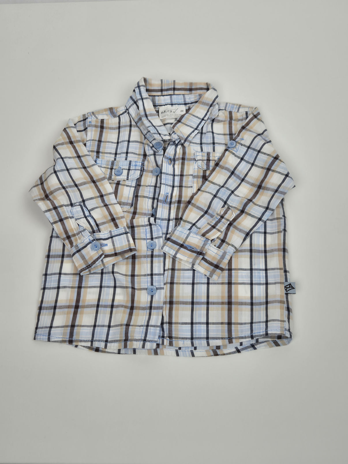 Kostkovaná chlapecká košile značky Okay ve velikosti 86 kombinuje světlé tóny bílé, béžové a modré, které působí svěže a zároveň elegantně. Košile má dlouhé rukávy s možností ohrnutí a zapínání na knoflíčky, dvě náprsní kapsy a efektní potisk traktoru na zádech, který potěší každého malého milovníka techniky. Skvělá volba pro slavnostnější příležitosti, ale i na běžné nošení do školky nebo na návštěvu. Lehký a příjemný materiál zajistí pohodlí po celý den.