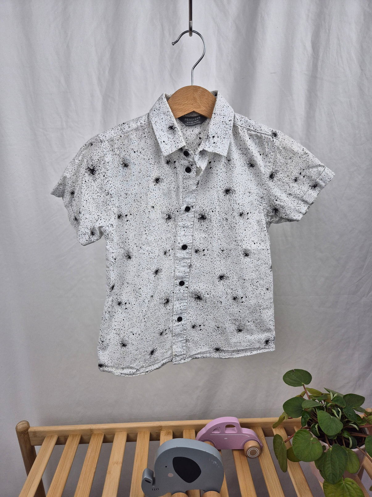 Chlapecká košile Primark ve velikosti 110 s krátkým rukávem v moderním designu – bílý podklad doplněný černými stříkanými detaily a vzorem pavouků. Skvělý kousek pro malé dobrodruhy, který se hodí do školky, školy i na výlety. Lehký materiál zajistí pohodlí po celý den.