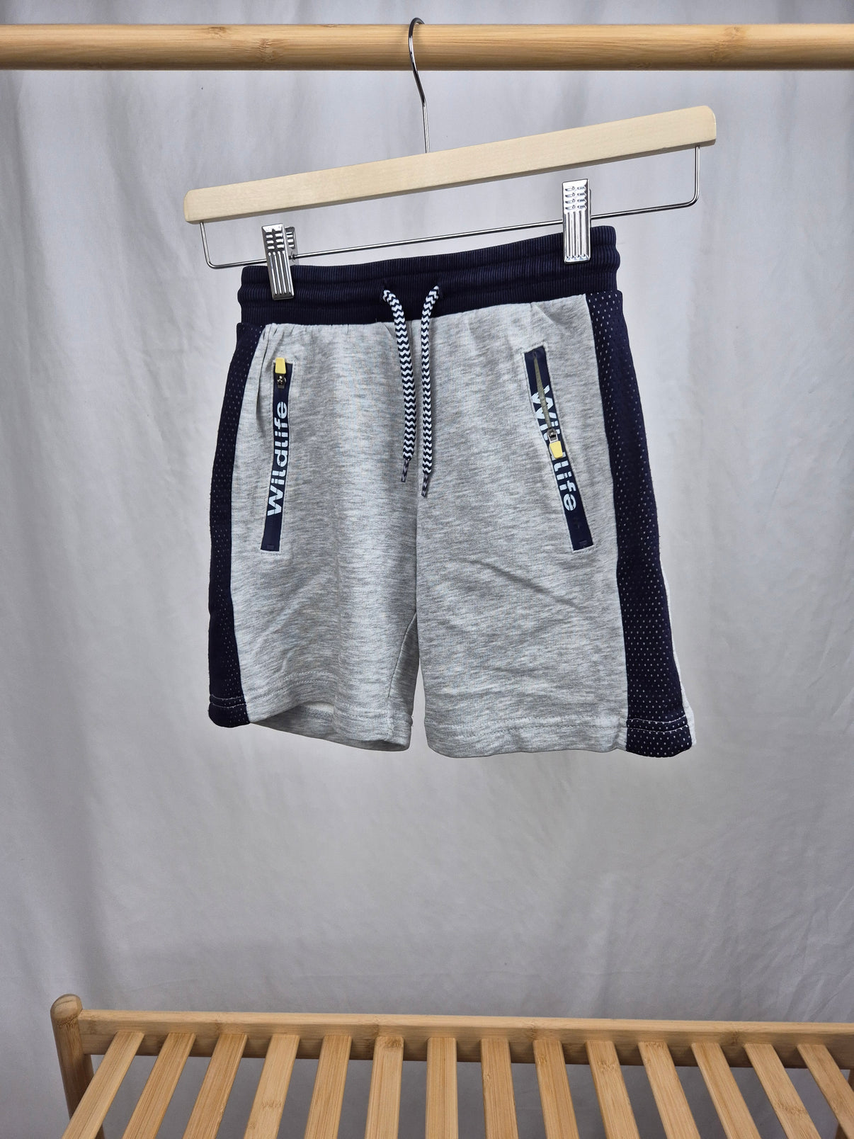 Sportovní kraťasy NKD ve velikosti 122/128 v kombinaci světle šedé a tmavě modré barvy s kontrastními detaily. Pružný pas se šňůrkou pro pohodlné nošení, dvě kapsy na zip s nápisem "Wildlife" a prodyšné boční panely z jemné síťoviny zajišťují skvělý komfort při pohybu. Ideální kousek pro aktivní kluky na léto, sport nebo hřiště.