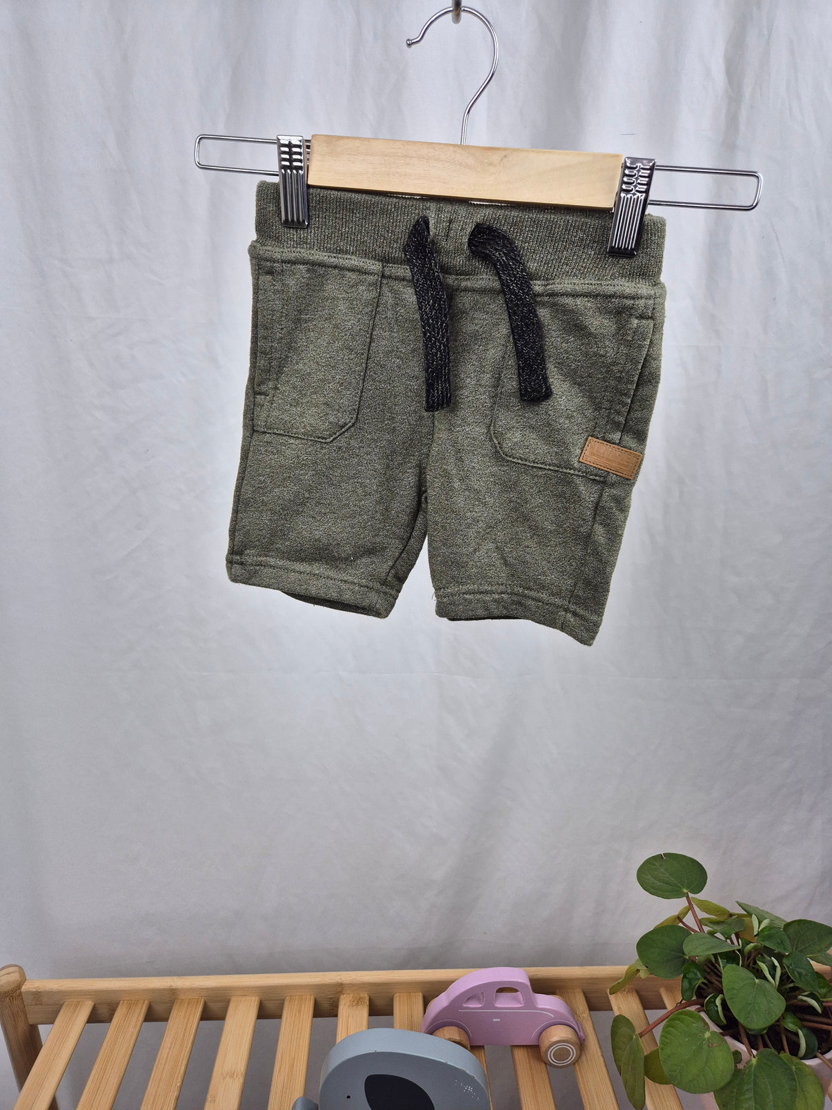 Pohodlné kraťasy Primark ve velikosti 86 pro kluky, v khaki zelené barvě s melírovaným efektem. Měkký pas do gumy s černou šňůrkou na stažení a dvěma praktickými kapsami vpředu. Univerzální kousek na každodenní nošení, ideální na hřiště, doma i na výlety.