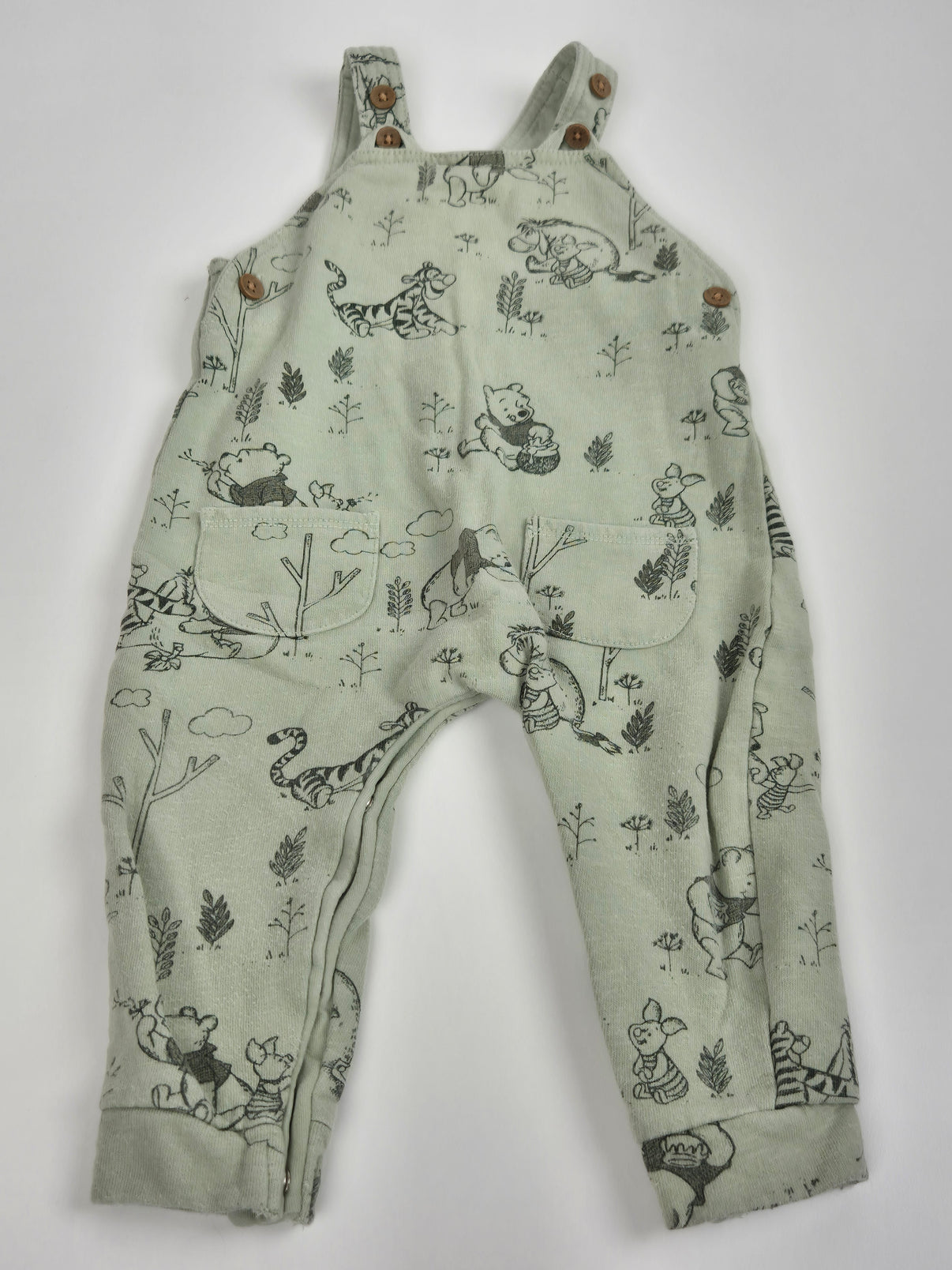 Laclové tepláky značky George s motivem Medvídka Pú, velikost 74/80. Jemný zelenošedý podklad zdobí celoplošný potisk oblíbených pohádkových postaviček – Pú, Tygra, Prasátka a Ijáčka – v hravých ilustracích. Tepláčky mají praktické kapsy na přední straně a zapínání na dřevěné knoflíčky na ramínkách i po stranách, což usnadňuje oblékání. Pohodlný střih je ideální pro malé holčičky i chlapečky na každodenní nošení.