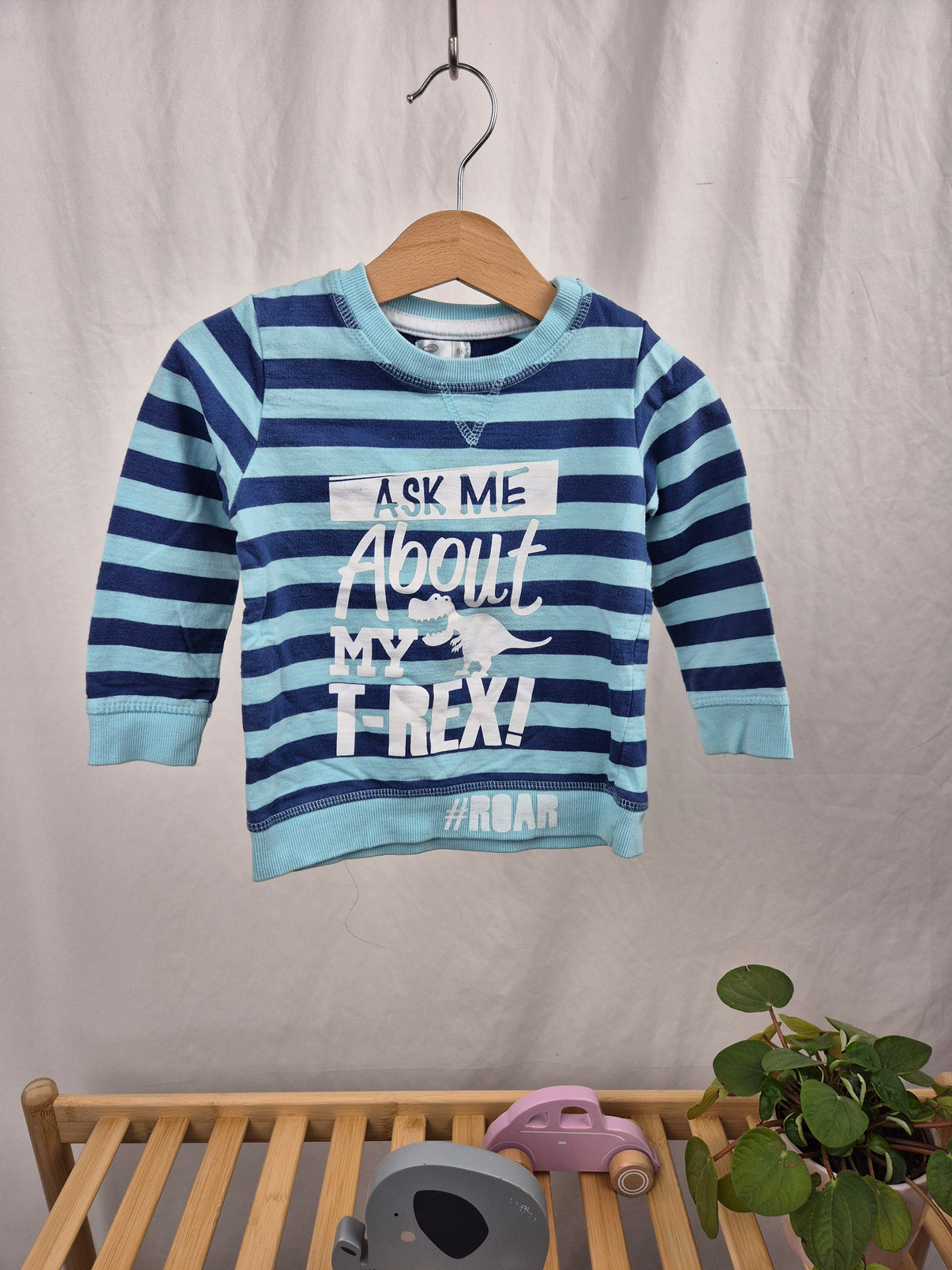 Lehká bavlněná mikina z Pepca v námořnických modrých pruzích potěší všechny malé milovníky dinosaurů. Vtipný nápis „Ask me about my T-Rex!“ s bílým motivem dinosaura a hashtagem #ROAR na spodním lemu dodává mikině hravý styl. Ideální na každodenní nošení do školky, na procházky i na doma – pohodlný střih a měkký materiál zajistí příjemné nošení. Skvělá volba pro kluky.