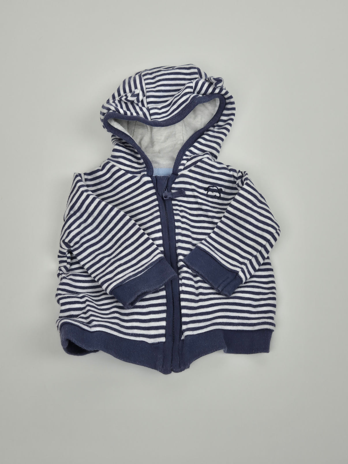 Pruhovaná mikinka George ve velikosti 56/62 je skvělým doplňkem do šatníku pro nejmenší chlapečky. Kombinace tmavě modré a bílé v klasickém proužku působí nadčasově, kapuce s oušky dodává mikině roztomilý vzhled. Zapínání na zip usnadní oblékání a příjemný měkký materiál zajistí pohodlí při každém nošení – ideální volba na procházky i na doma.
