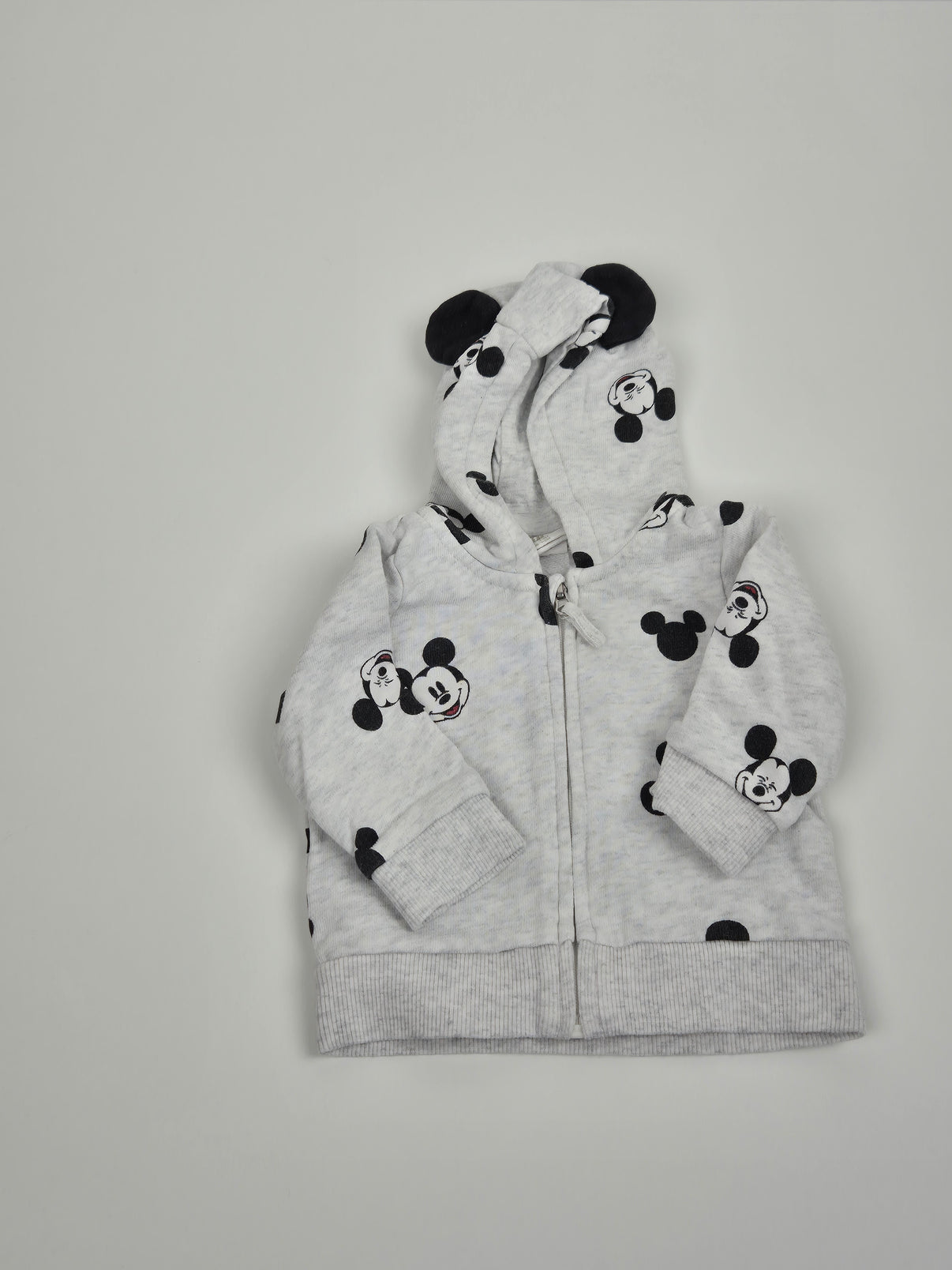 Roztomilá mikina s kapucí značky H&M ve velikosti 56 potěší všechny malé fanoušky Mickey Mouse. Světle šedý podklad zdobí hravý potisk obličejů Mickeyho v různých výrazech, což dodává mikině veselý a stylový vzhled. Kapuce je doplněná černými oušky, které dodávají celému kousku extra roztomilost. Praktický zip usnadňuje oblékání a příjemný bavlněný materiál zajišťuje pohodlí po celý den.