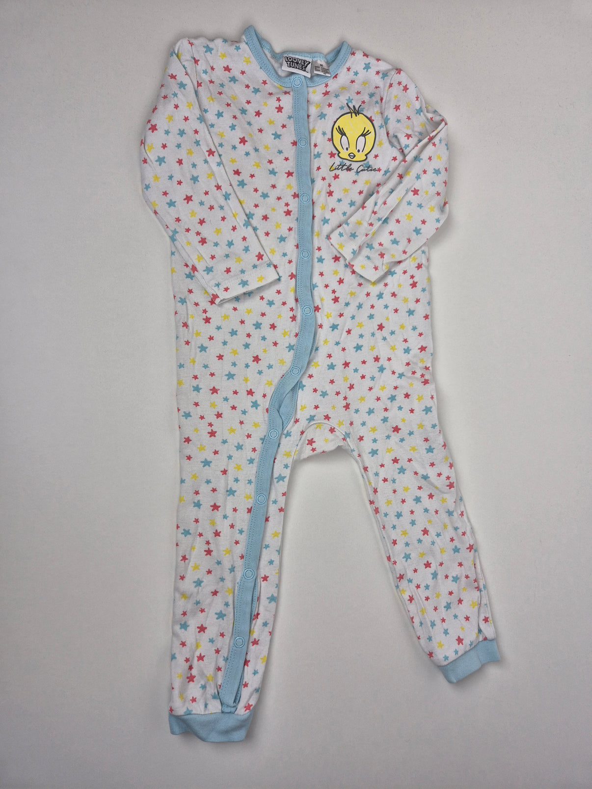 Veselý dětský overal s motivem Looney Tunes je jako stvořený pro pohodlné spaní i lenošení doma. Bílý podklad zdobí barevné hvězdičky v odstínech modré, červené a žluté, které rozzáří každý den. Na hrudi najdeš výšivku populárního ptáčka Tweetyho s nápisem Little Cutie. Modré lemování a zapínání na patentky po celé délce usnadní oblékání i přebalování. Díky měkkému bavlněnému materiálu je overal příjemný na dotek a šetrný k dětské pokožce. Unisex design pro holčičky i kluky.
