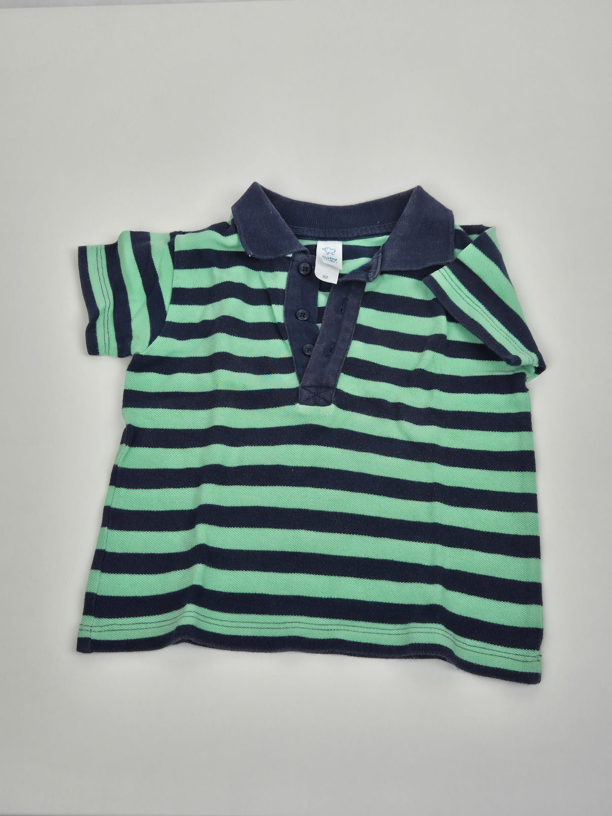 Stylové polotričko značky C&A ve velikosti 92 pro malé elegány. Kombinace tmavě modrých a světle zelených pruhů dodává tričku moderní vzhled, který se hodí jak na každodenní nošení, tak i na návštěvu nebo slavnostnější příležitosti. Límec a zapínání na knoflíčky podtrhují klasický polo styl. Příjemný bavlněný materiál zajistí pohodlí po celý den. Skvělý kousek do šatníku každého chlapečka.