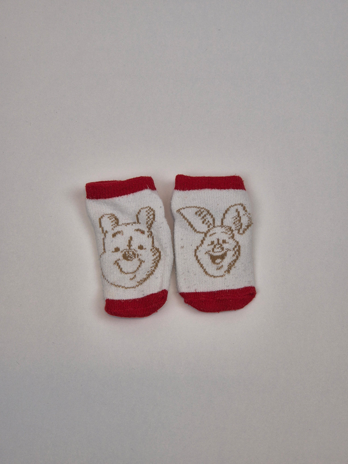 Roztomilé kojenecké ponožky s motivem Medvídka Pú a jeho kamaráda Prasátka potěší každého malého fanouška pohádek. Bílé ponožky s kontrastními červenými lemy na špičkách a horním okraji jsou vyrobeny z měkkého a pružného materiálu, který jemně obepne nožičku a dobře drží. Ideální doplněk pro holčičky i kluky ve velikosti 62/68 – hravé, pohodlné a plné pohádkové radosti.