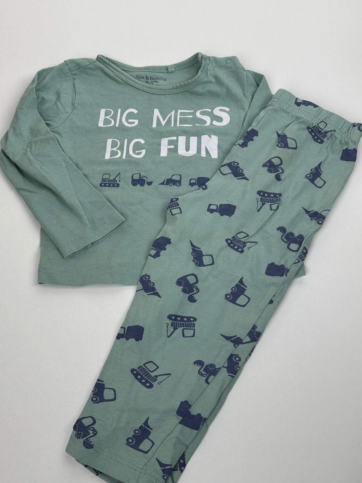 Dvoudílné chlapecké pyžamo značky Sinsay ve velikosti 92 v jemné zelené barvě s potiskem stavebních strojů a nápisem "BIG MESS BIG FUN" potěší malé milovníky bagrů a náklaďáků. Pohodlný bavlněný materiál a pružný pas zaručují klidný spánek i pohodlí při večerním dovádění. Skvělé na doma i na spaní na cestách.