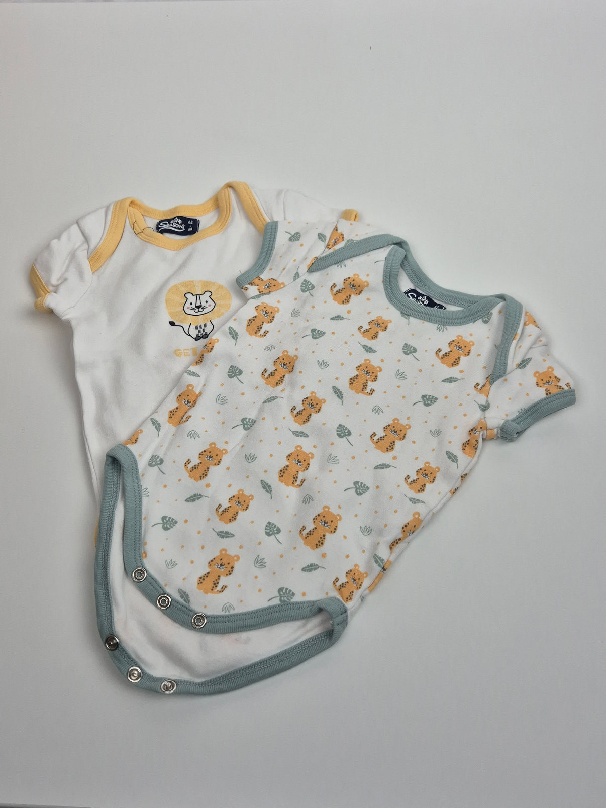 Roztomilá sada dvou body s krátkým rukávem v jemných přírodních tónech. Jedno body je krémové s veselým motivem lvíčka a žlutým lemováním, druhé má celoplošný vzor malých zvířátek a lístků...