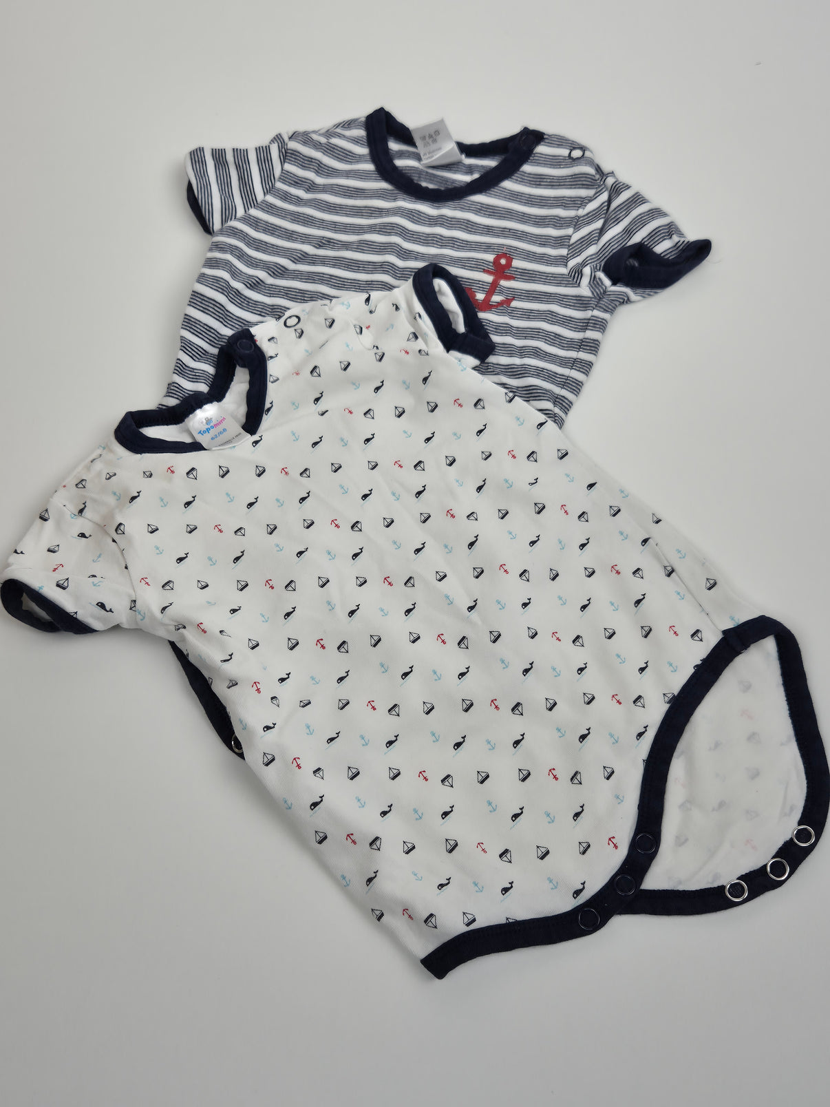 Stylová sada dvou krátkorukávových body v námořnickém stylu. Jedno body je bílé s drobným potiskem lodiček, kotviček a velryb, druhé pruhované v bílo-tmavě modré kombinaci s červenou kotvou. Měkký bavlněný materiál je příjemný na dotek a vhodný pro citlivou dětskou pokožku. Praktické zapínání na druky v rozkroku usnadní přebalování. Ideální sada na léto, snadno kombinovatelná a vhodná pro kluka.