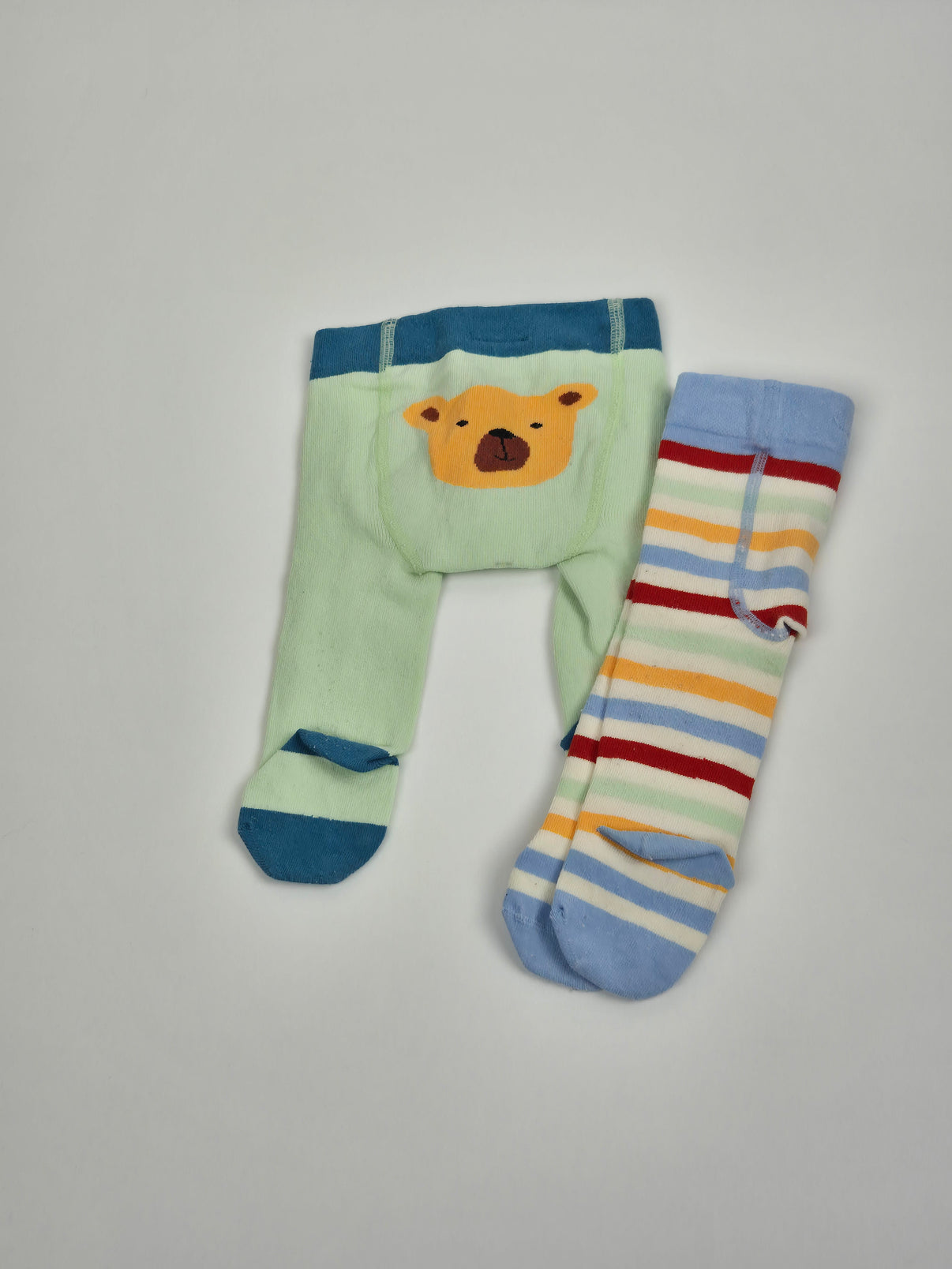 Veselá sada 2 kusů dětských punčocháčů značky Rossmann ve velikosti 62/68 potěší každého malého prcka. První pár je v jemné mátové barvě s tmavě tyrkysovými detaily a roztomilým medvídkem na zadečku. Druhý pár zdobí barevné proužky v kombinaci modré, žluté, červené a bílé – hravý a optimistický design, který krásně oživí každý outfit. Příjemný pružný materiál se pohodlně nosí a dobře drží tvar.
