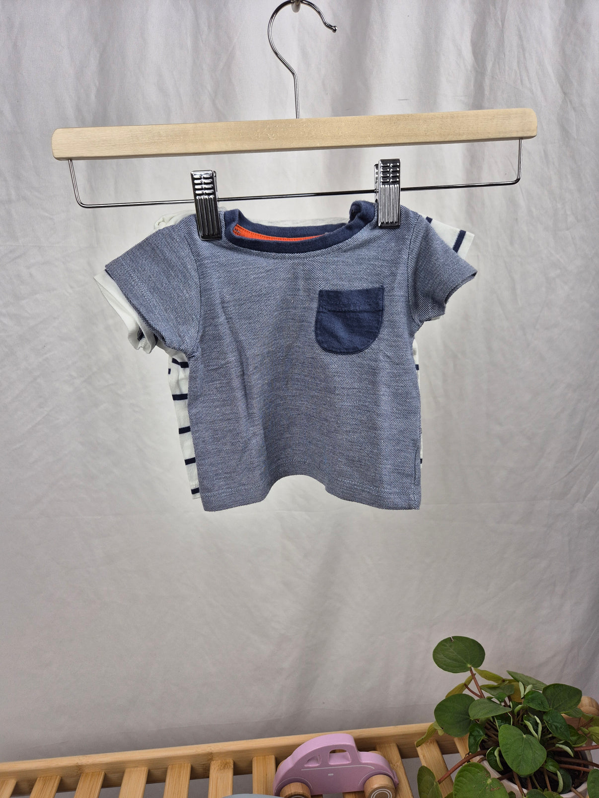 Sada dvou letních triček s krátkým rukávem značky Early Days pro chlapečka ve velikosti 62. První kousek je jednobarevné tričko v modrém melíru s náprsní kapsičkou, druhé je bílé s tmavě modrými pruhy a světle šedou kapsičkou. Obě trička jsou z měkké bavlny a ideální na teplé dny – na výlety i každodenní nošení. Praktické zapínání na rameni usnadní oblékání.