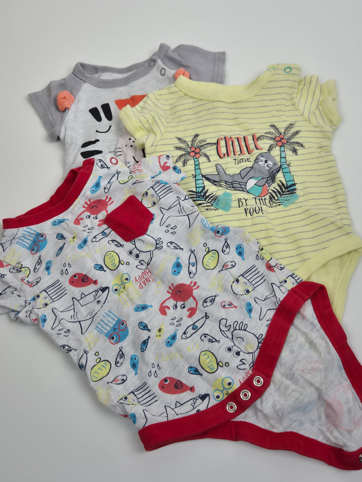 Veselá sada 3 kojeneckých body značky Pepco ve velikosti 74, ideální na letní dny i jako spodní vrstva. Každé body má jiný, hravý design: jedno ve světlém šedém tónu s roztomilým motivem, druhé světle žluté s letním potiskem a nápisem Chill time by the pool a třetí s barevným celoplošným potiskem mořských zvířátek v kombinaci bílé, modré, červené a žluté. Barvy jsou svěží, veselé a celá sada působí hravě a letně – vhodná jak pro kluka, tak klidně i univerzálně.