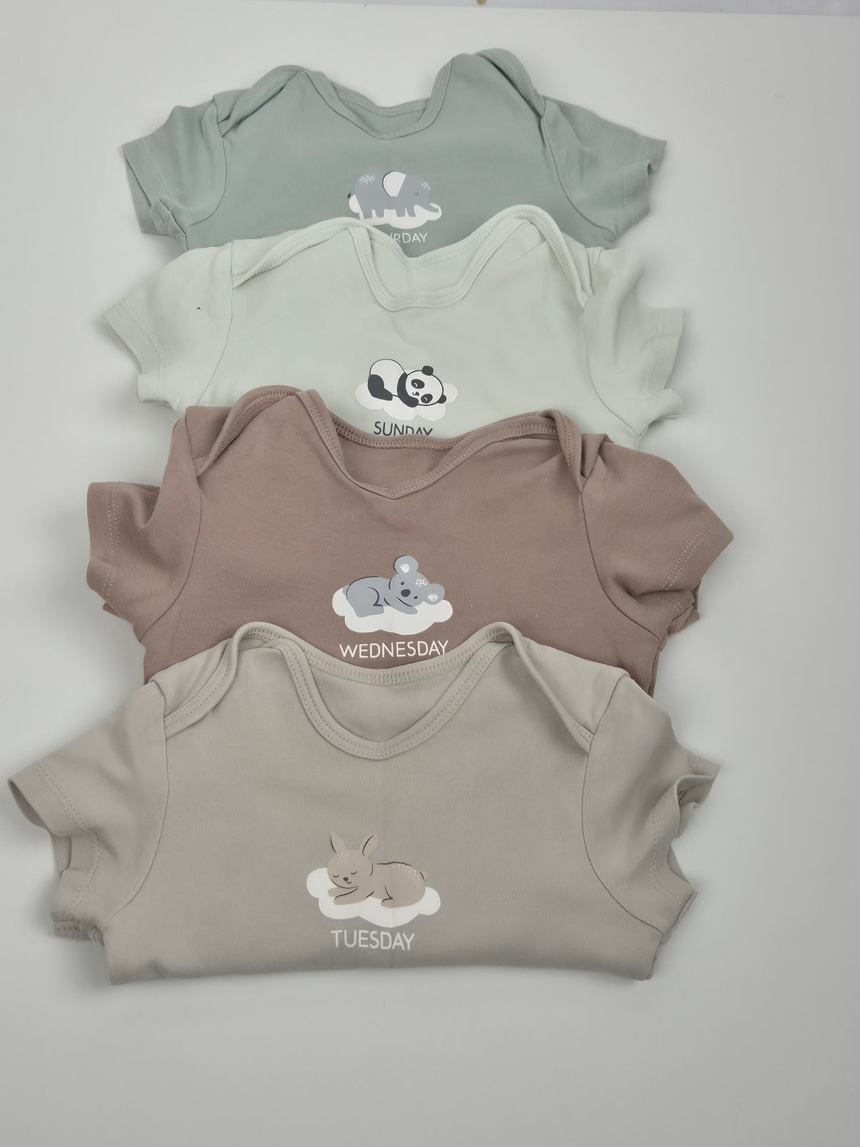 Sada 4 ks body C&A ve velikosti 92 je skvělou volbou pro pohodlné každodenní nošení. Každé body má krátký rukáv a je vyrobené z příjemné bavlny v jemných pastelových odstínech s milými zvířecími motivy a nápisy jednotlivých dnů v týdnu. Praktický střih s obálkovým výstřihem a zapínáním mezi nožičkami usnadní oblékání i přebalování. Ideální volba pro holčičky i kluky na doma, do školky nebo na spaní.