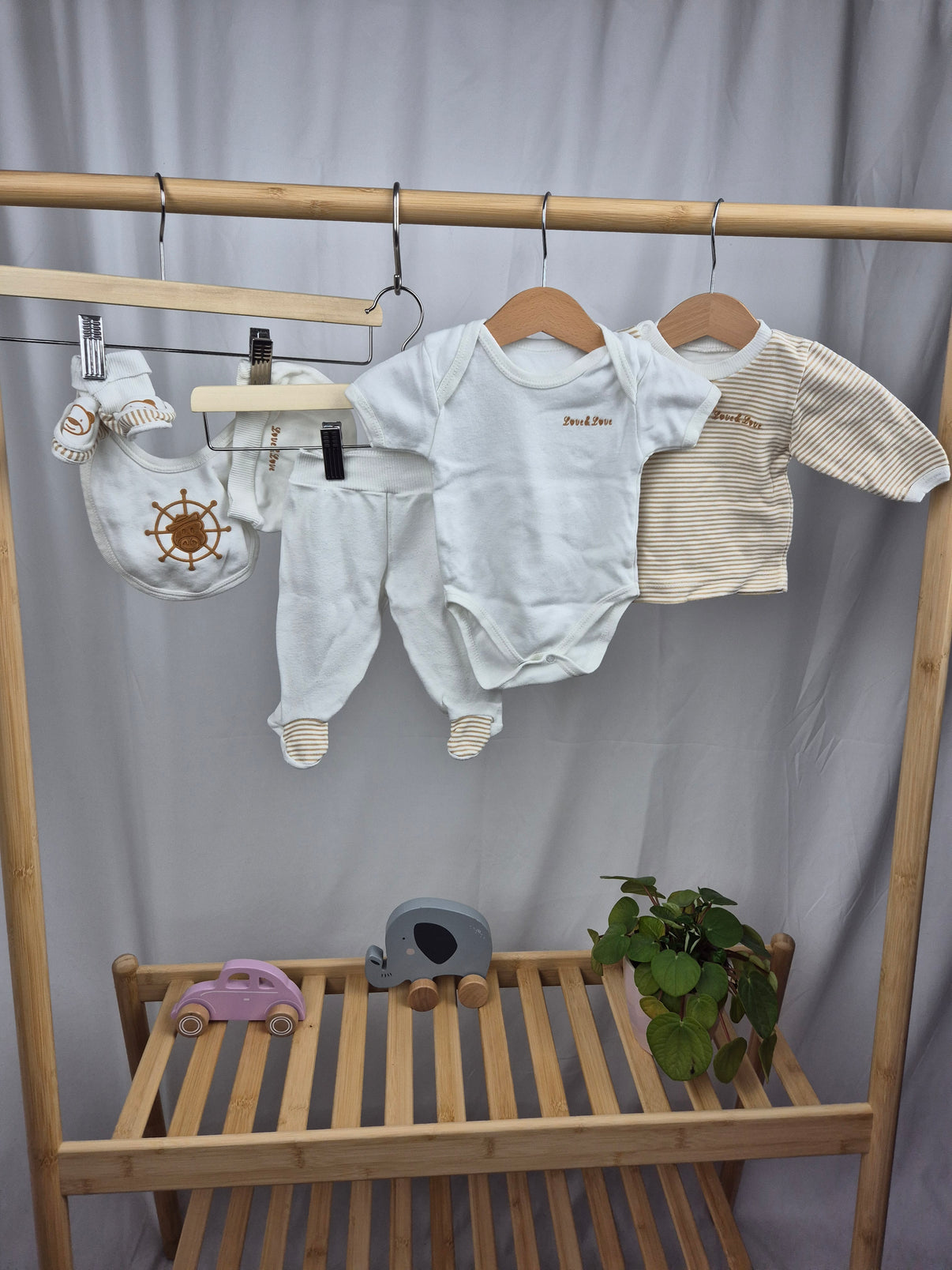 Roztomilá šestidílná sada pro novorozence ve velikosti 56 je skvělým základem do výbavičky. V jemných tónech bílé a béžové s námořnickými motivy a nápisem „Love & Love“ sada obsahuje body s krátkým rukávem, tričko s dlouhým rukávem, polodupačky, bryndák, rukavičky a capáčky. Vše je z příjemného, měkkého materiálu, který je šetrný k citlivé pokožce miminka. Praktické, sladěné a unisex – ideální jako dárek k narození miminka nebo první dny v porodnici.