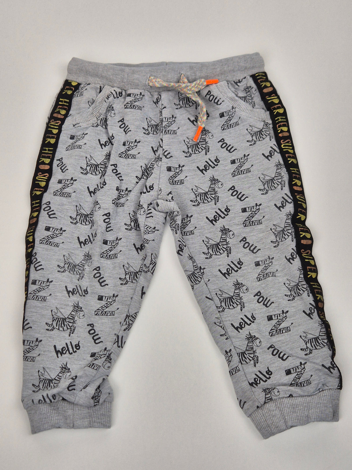 Veselé dětské tepláčky značky Coccodrillo v světle šedé barvě s celoplošným potiskem zebry, nápisů „hello“ a „pow“ přináší hravost i pohodlí v jednom. Na bocích jsou ozdobeny černými pruhy s barevným nápisem „SUPER HERO“, které dodávají sportovní styl. Tepláky mají elastický pas se šňůrkou a žebrované lemy na nohavicích, což zajišťuje pohodlné nošení. Skvělý kousek pro kluky na doma, do školky i na dobrodružství venku.