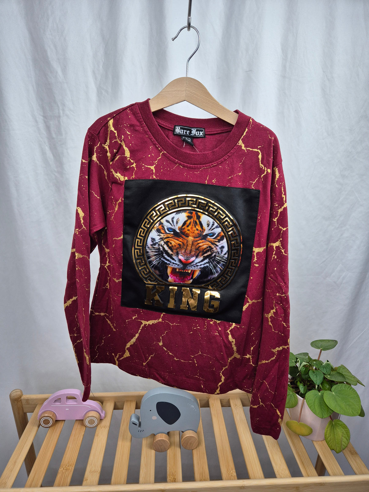 Stylové  tričko s dlouhým rukávem značky Bare Fox ve velikosti 164 zaujme na první pohled. Výrazný vínový podklad s mramorovým efektem ve zlaté barvě doplňuje dominantní potisk tygra s nápisem "KING" ve zlatém 3D efektu. Kvalitní zpracování a pohodlný materiál zajišťují příjemné nošení po celý den.