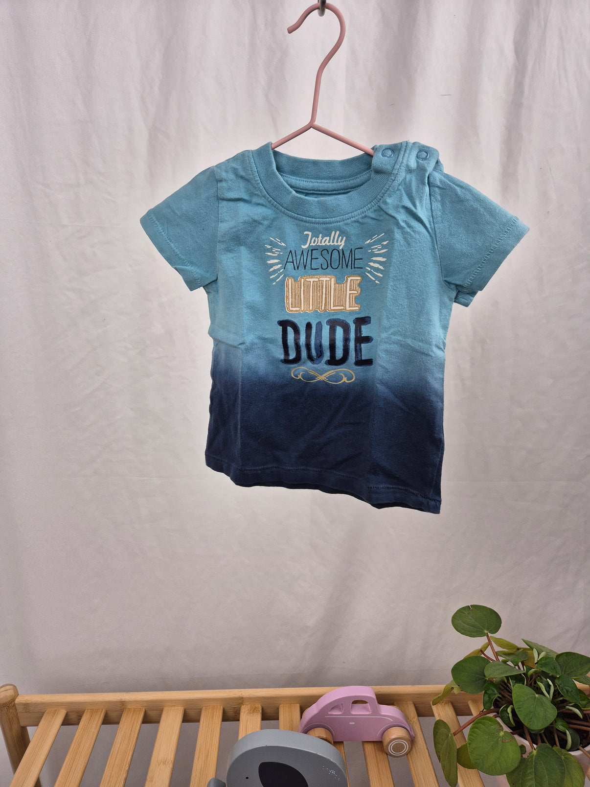 Stylové tričko Early Days ve velikosti 80 zaujme efektním ombré přechodem ze světle modré do tmavě námořnické. Přední stranu zdobí hravý nápis „Totally awesome little dude“, který se skvěle hodí pro malého rošťáka. Praktické zapínání na rameni usnadní oblékání. Ideální volba na každodenní nošení pro chlapečka.