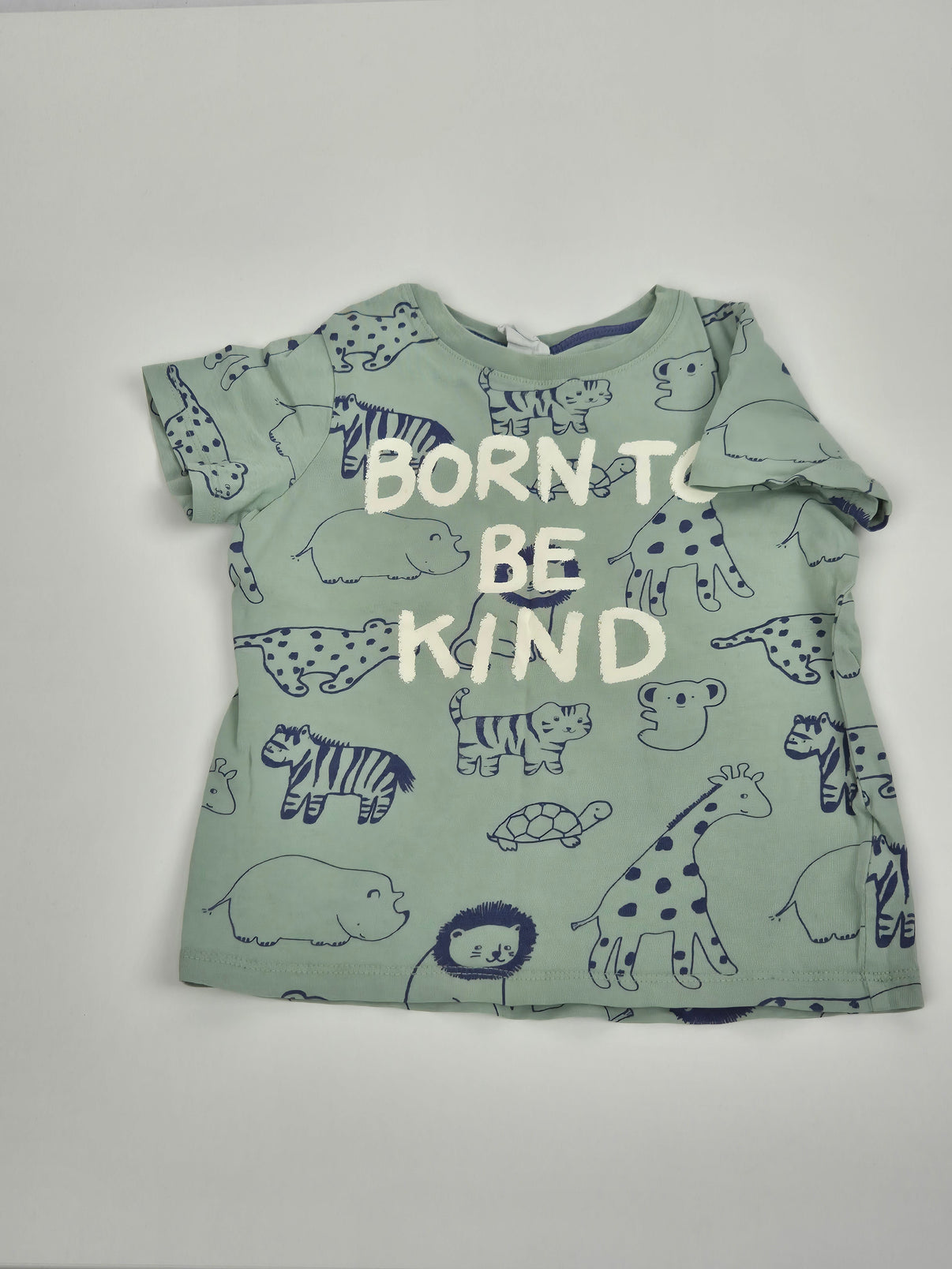 Roztomilé tričko z kolekce H&M v jemně zelené barvě s celoplošným potiskem zvířátek a výrazným nápisem Born to be kind. Příjemný bavlněný materiál a pohodlný střih z něj dělají skvělý kousek pro každodenní nošení – do školky, na procházku nebo jen tak na hraní.