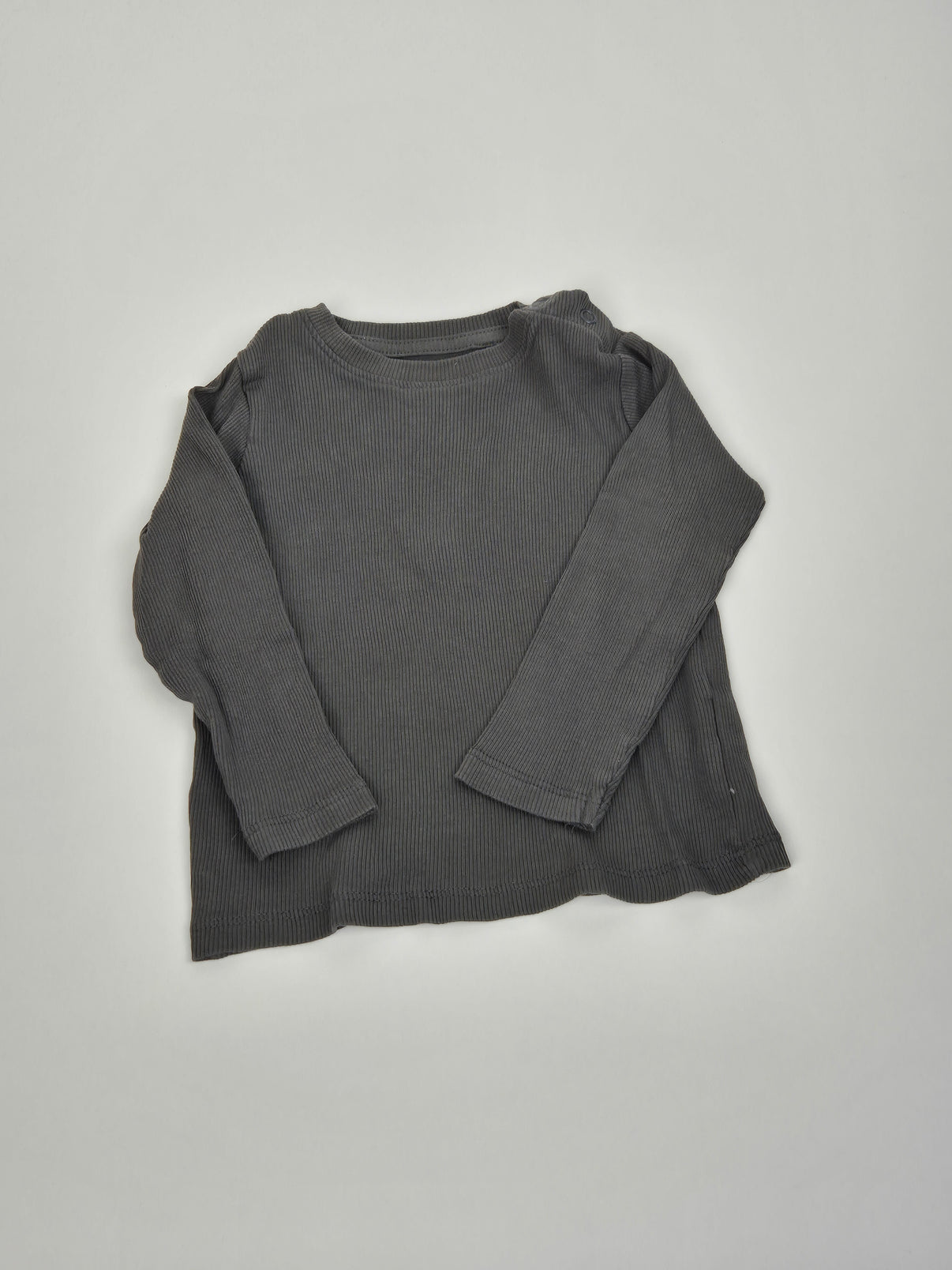 Pohodlné dětské tričko s dlouhým rukávem ve tmavě antracitové barvě, vyrobené z měkkého žebrovaného materiálu, který je příjemný na dotek i nošení. Díky praktickému zapínání na patentky na rameni se snadno obléká i svléká, což ocení hlavně menší děti. Minimalistický styl bez potisků z něj dělá univerzální kousek do školky, na hřiště i na doma.