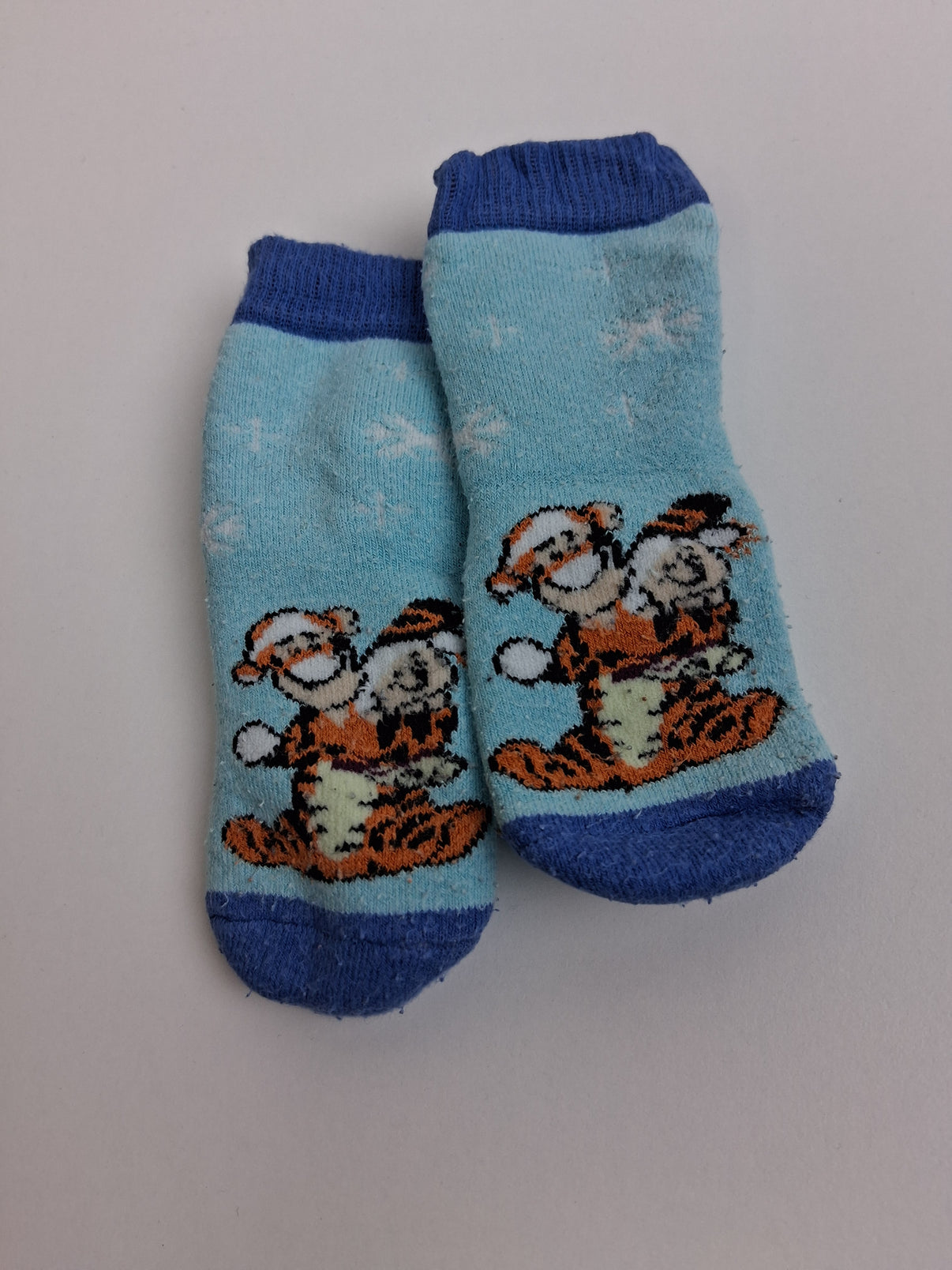 Veselé vánoční ponožky ve světle modré barvě s motivem Tygra a Medvídka Pú v čepicích jsou roztomilým doplňkem pro zimní období. Modrý lem, paty i špičky dodávají ponožkám kontrast a pohodlný střih zajistí, že dobře drží na nožce. Velikostně odpovídají zhruba velikosti 92.