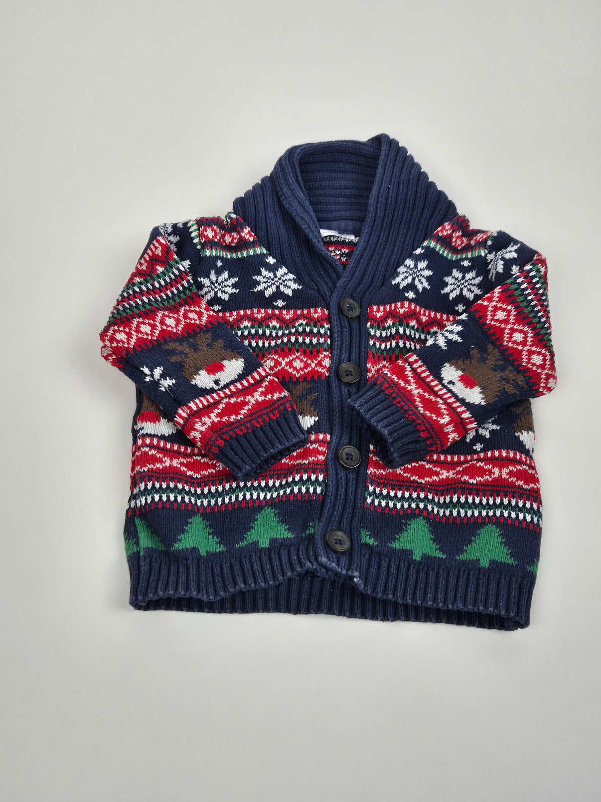 Veselý vánoční svetr F&F ve velikosti 68 rozzáří každé sváteční období. Pletený vzor kombinuje tradiční motivy jako soby, sněhové vločky, stromečky a červenobílé geometrické prvky. Námořnicky modrý základ doplňují kontrastní barvy a výrazný límec, který dodává svetru šmrnc. Zapínání na knoflíky zajišťuje snadné oblékání. Ideální pro holčičky i chlapečky na vánoční focení, návštěvy i rozbalování dárků u stromečku.