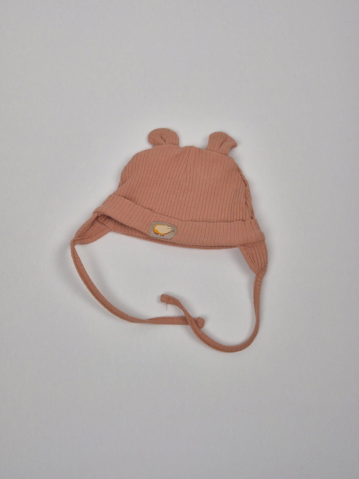 Roztomilá žebrovaná čepička s oušky v teplém terakotovém odstínu, ideální pro miminka na chladnější dny. Měkký bavlněný materiál je příjemný na dotek a šetrný k citlivé dětské pokožce. Díky zavazování pod bradou čepička skvěle drží na místě. Na ohrnutém lemu je decentní aplikace s ježečkem. Vhodná pro holčičky i kluky. Kousek pochází z kolekce značky Pepco.