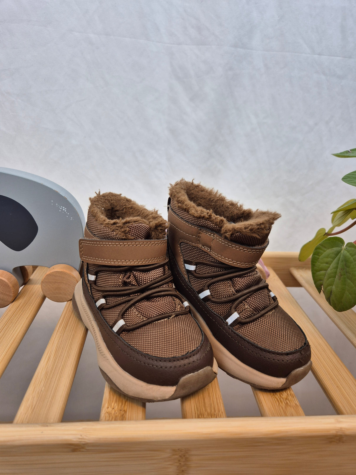 Teplé zimní boty H&M ve velikosti 23 v hnědém provedení s kontrastními prvky a světlou podrážkou. Uvnitř jsou zateplené huňatým kožíškem, který udrží dětské nožky v teple i během mrazivých dní. Zapínání na suchý zip v kombinaci s elastickým šněrováním zajišťuje snadné obouvání a bezpečné držení na noze.