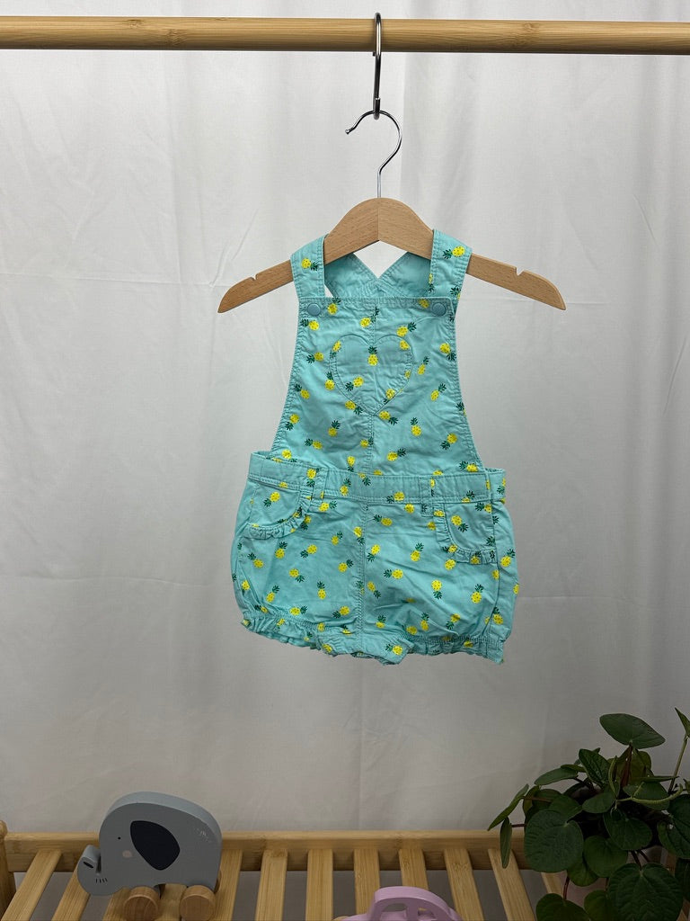 Roztomilý kraťasový overal od značky C&A ve velikosti 74 je skvělou volbou na teplé letní dny. Svěží mentolová barva s potiskem veselých žlutých ananasů dodává oblečení hravý vzhled. Praktické zapínání na ramínkách a knoflíky usnadňuje oblékání. Overal má prostorné kapsy a volné nohavice, které zajišťují pohodlí a volnost pohybu. Ideální pro malé princezny na výlety, procházky i hry na zahradě. Kombinujte s lehkými sandálky pro dokonalý letní outfit!