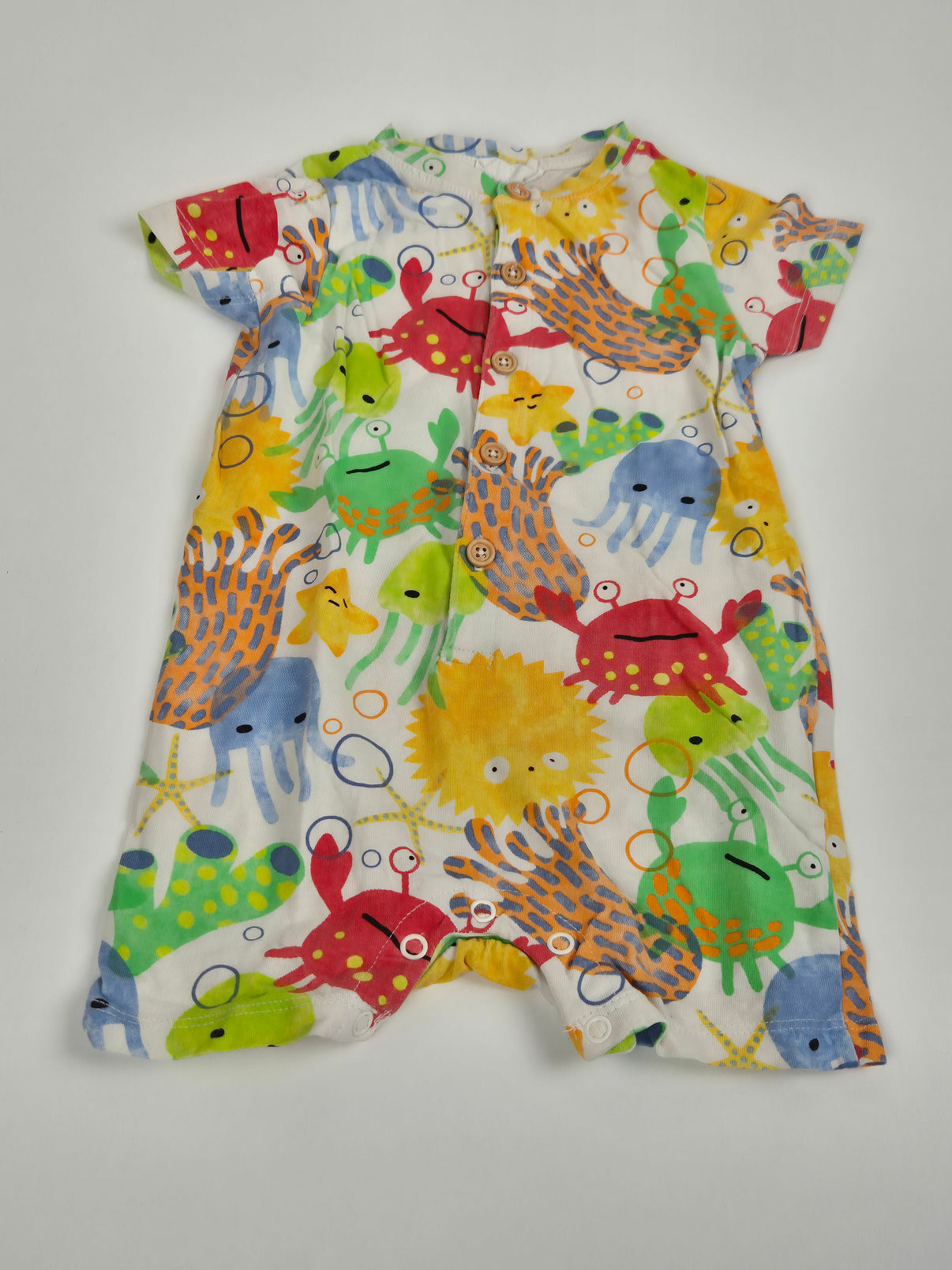 Barevný kraťasový overal Coccodrillo s veselým potiskem mořských zvířátek – krabů, hvězdic, chobotnic i rybiček. Praktické zapínání na knoflíčky v horní části a patentky mezi nožičkami usnadní oblékání i přebalování. Lehké a vzdušné provedení je ideální na léto, dovolenou nebo hravé dny venku. Velikost 80, vhodné pro kluky i holčičky.