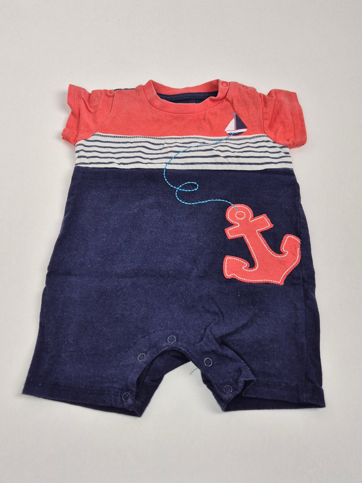Kraťasový overal v letním námořnickém stylu, ideální na horké dny i dovádění venku. Horní část v korálově červené doplňuje proužkovaný střed a tmavě námořnicky modrá spodní část. Velká aplikace kotvy a malá loďka dodávají hravý, prázdninový vzhled. Lehounký bavlněný materiál a patentky mezi nožičkami zajišťují pohodlné oblékání. Skvělý kousek pro kluka.
