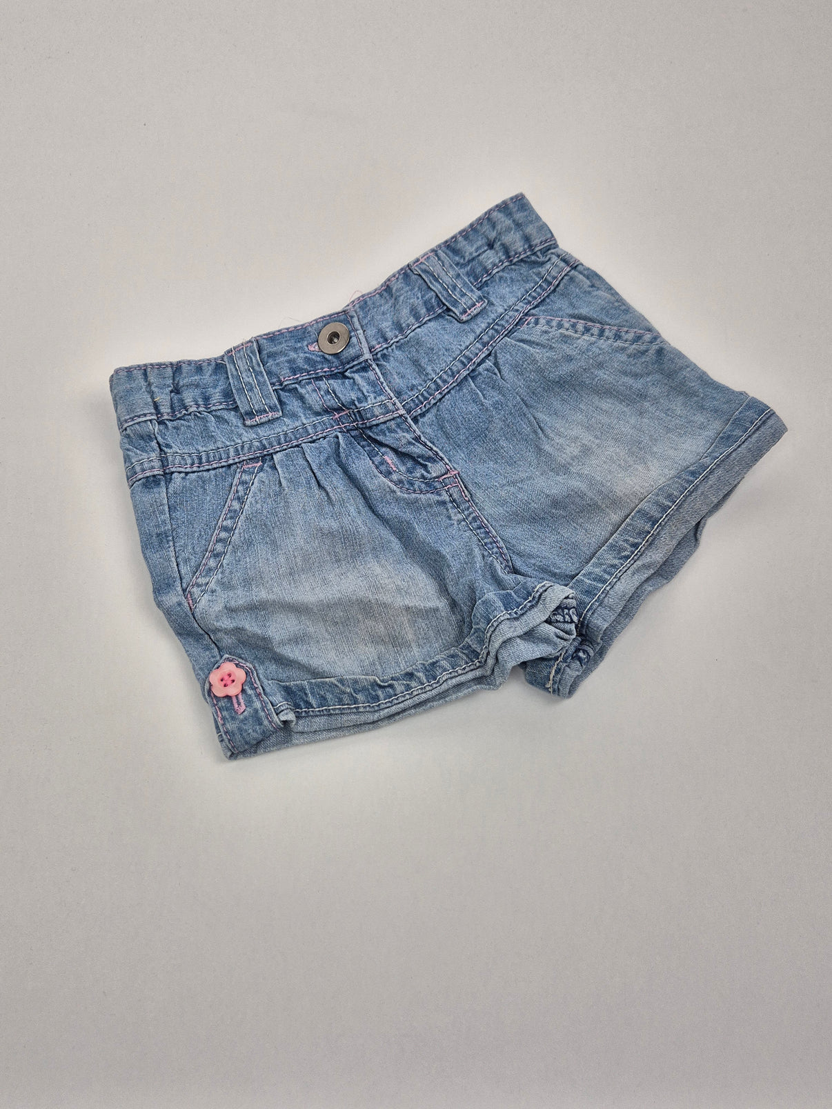 Roztomilé dívčí džínové kraťasy Tu v světle modrém denimu, příjemně měkké a lehké na letní nošení. Mají pružný pas pro pohodlné obléknutí, praktické kapsy vpředu i vzadu a růžové knoflíčky na nohavičkách, které dodávají hravý detail. Skvělé na hřiště, na výlety i do školky – univerzální letní kousek pro holčičku ve velikosti 80/86.