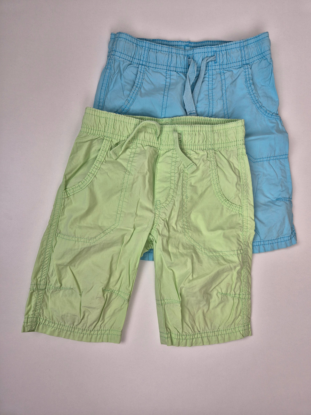 Lehké šortky z tenčí bavlny mají pružný pas se šňůrkou a volnější střih, který je ideální na hřiště, školku i dovolenou. Světle modrý a světle zelený pár působí svěže a letně.