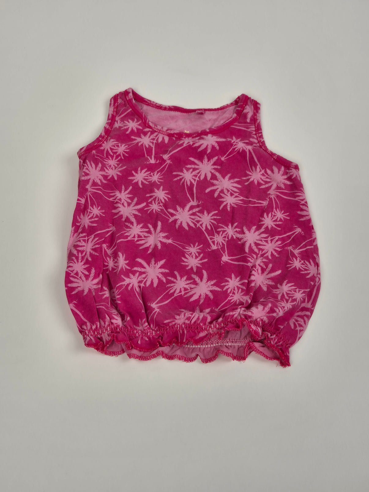 Růžové tílko Lupilu ve velikosti 86/92. Lehký a vzdušný materiál, ideální na teplé letní dny. Celoplošný potisk palem, pružný spodní lem se zakončením na gumičku.