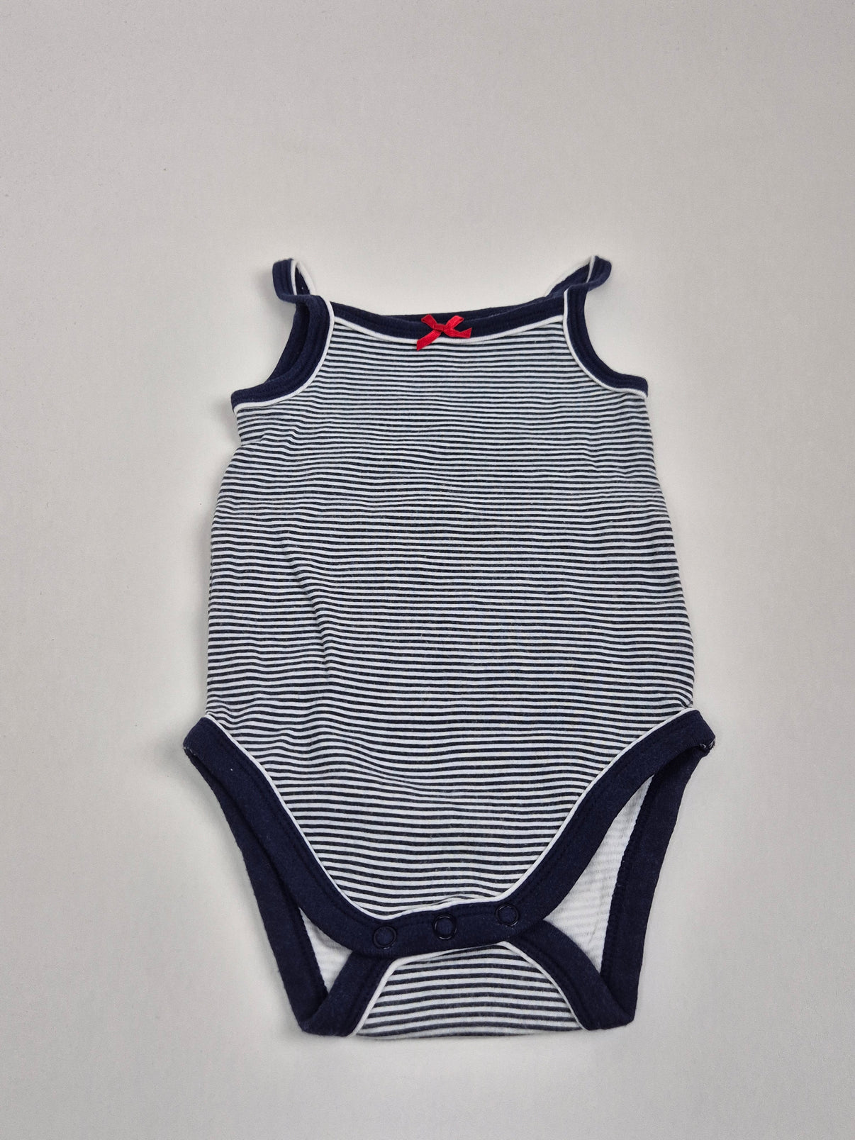 Roztomilé letní tílkové body C&A ve velikosti 80, ideální do teplých dnů. Námořnické proužky v kombinaci s tmavě modrým lemováním působí svěže a nadčasově, ozdobná červená mašlička na hrudi dodává kousku jemný holčičí detail. Příjemná bavlna a zapínání mezi nožičkami zajišťují pohodlné oblékání i nošení.
