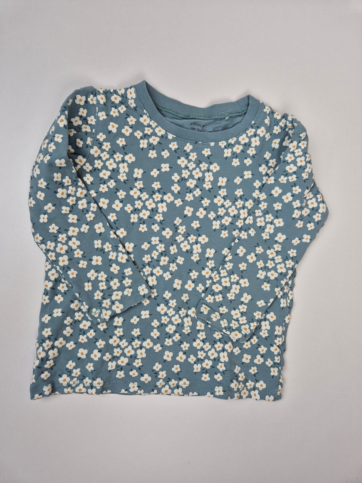 Pohodlné dívčí tričko Lindex ve velikosti 98 – příjemný bavlněný materiál, který je měkký a skvělý na celodenní nošení. Základ tvoří jemná modrošedá barva s roztomilým celoplošným potiskem bílých kytiček s žlutým středem, takže působí velmi něžně a univerzálně. Tričko je ideální do školky, na hřiště i na běžné nošení během celého roku.