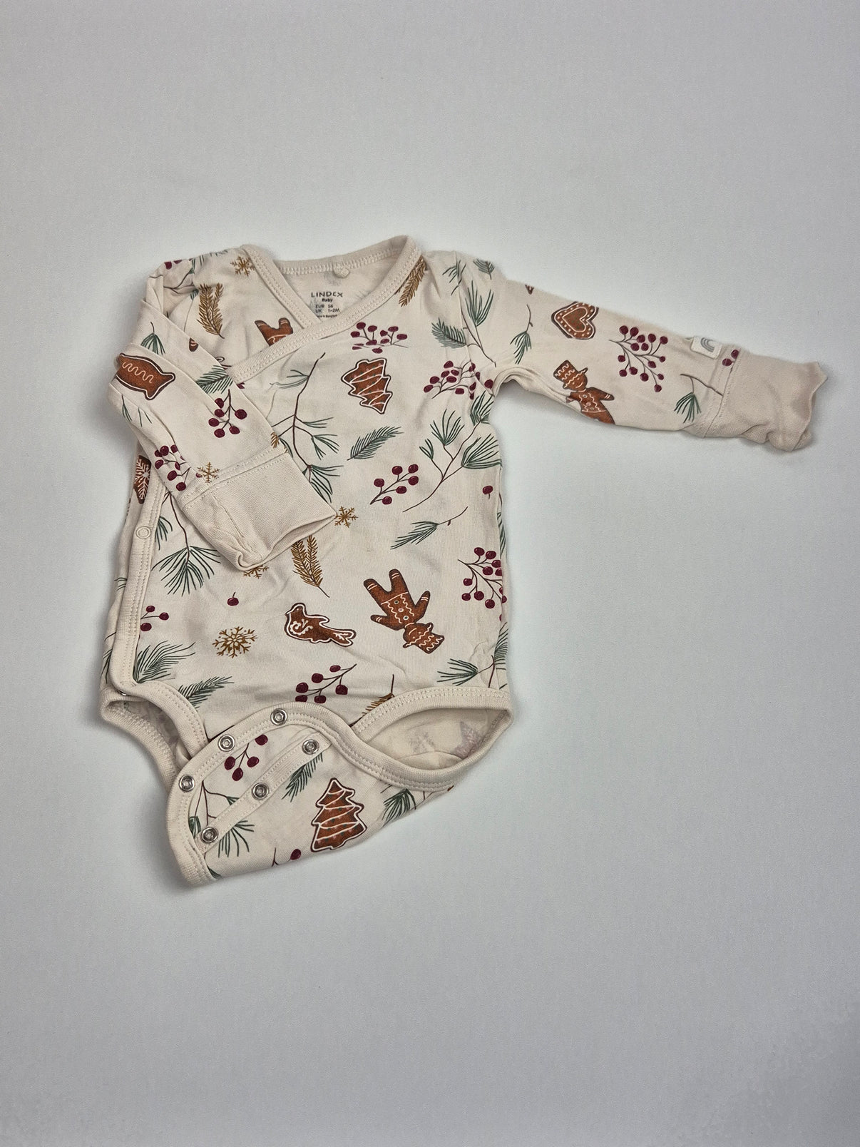 Krásné sváteční zavinovací body v jemném krémovém odstínu s vánočním motivem perníčků, větviček a lesních detailů. Měkký a příjemný materiál je šetrný k citlivé dětské pokožce. Praktické zavinovací zapínání a druky v rozkroku výrazně usnadní oblékání i přebalování, ideální pro nejmenší miminka.